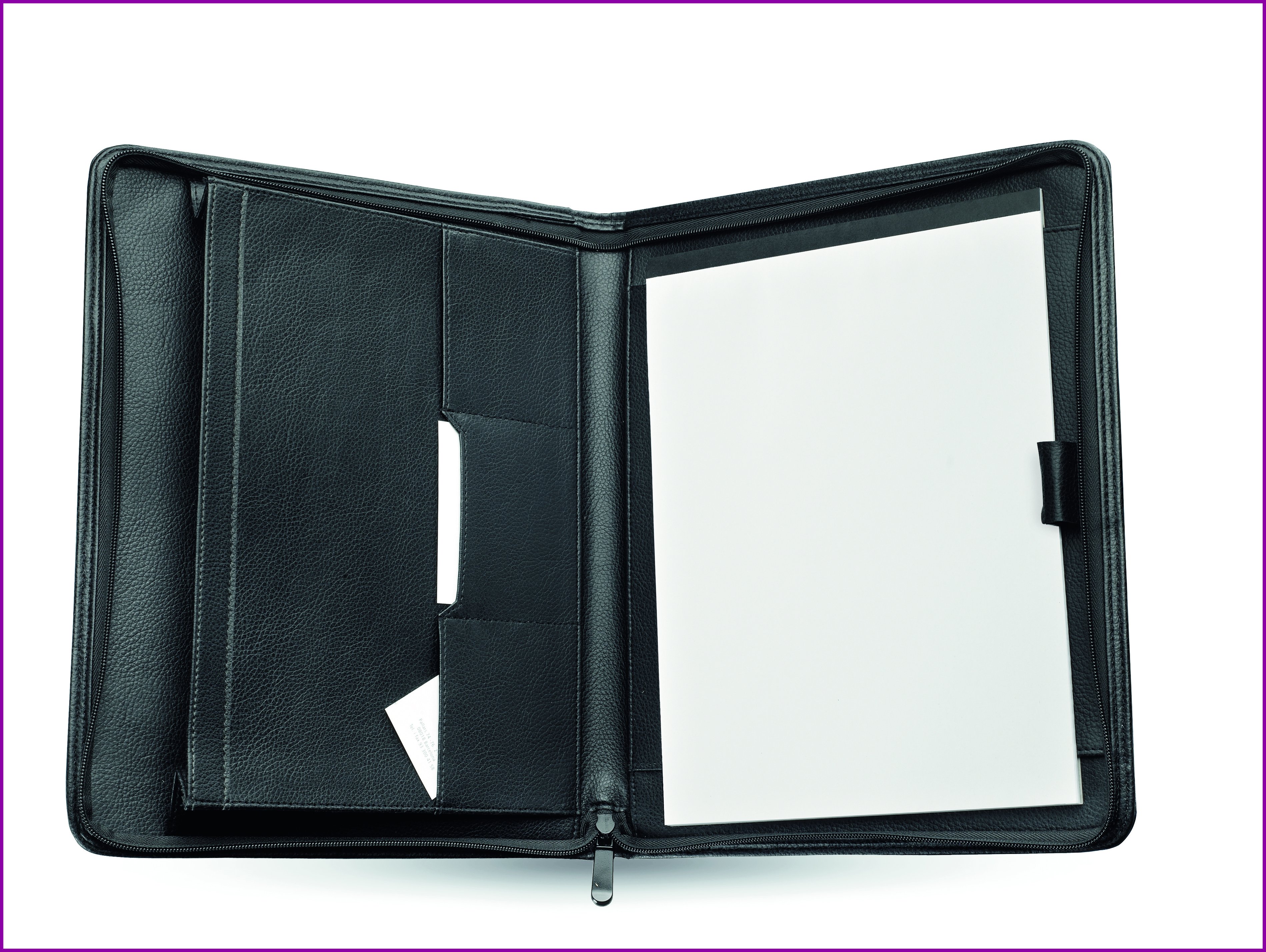 A4 kansio vetoketjulla, nahkapäällisellä ja PU-pohjalla. Sisältää 25 sivuisen muistilehtiön.
