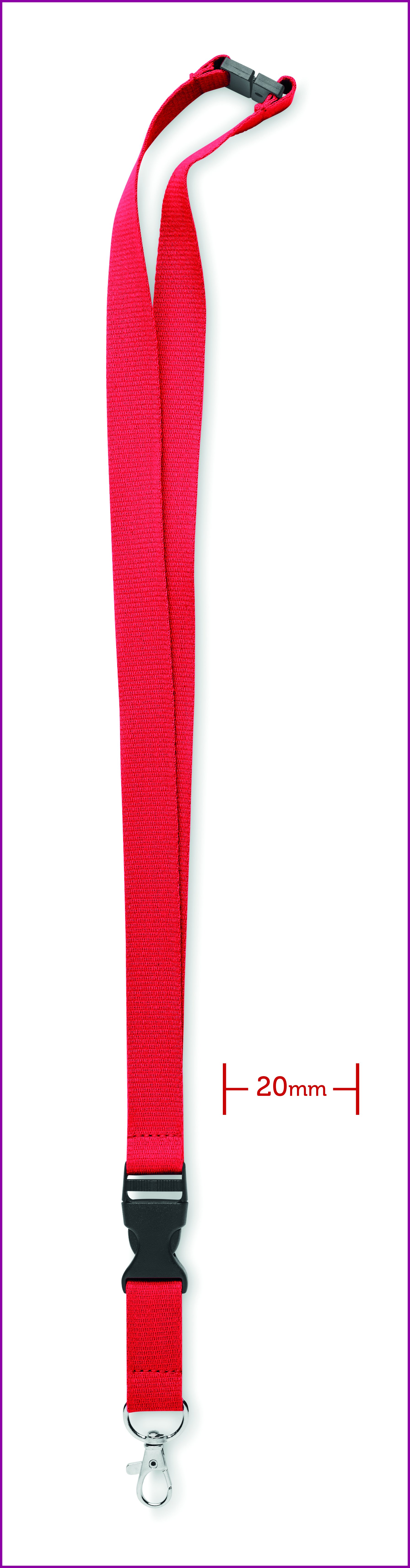 Puuvillakaulanauha, jossa on papukaijalukko, irrotettava pikalukko ja turvalukko, leveys 20 mm.