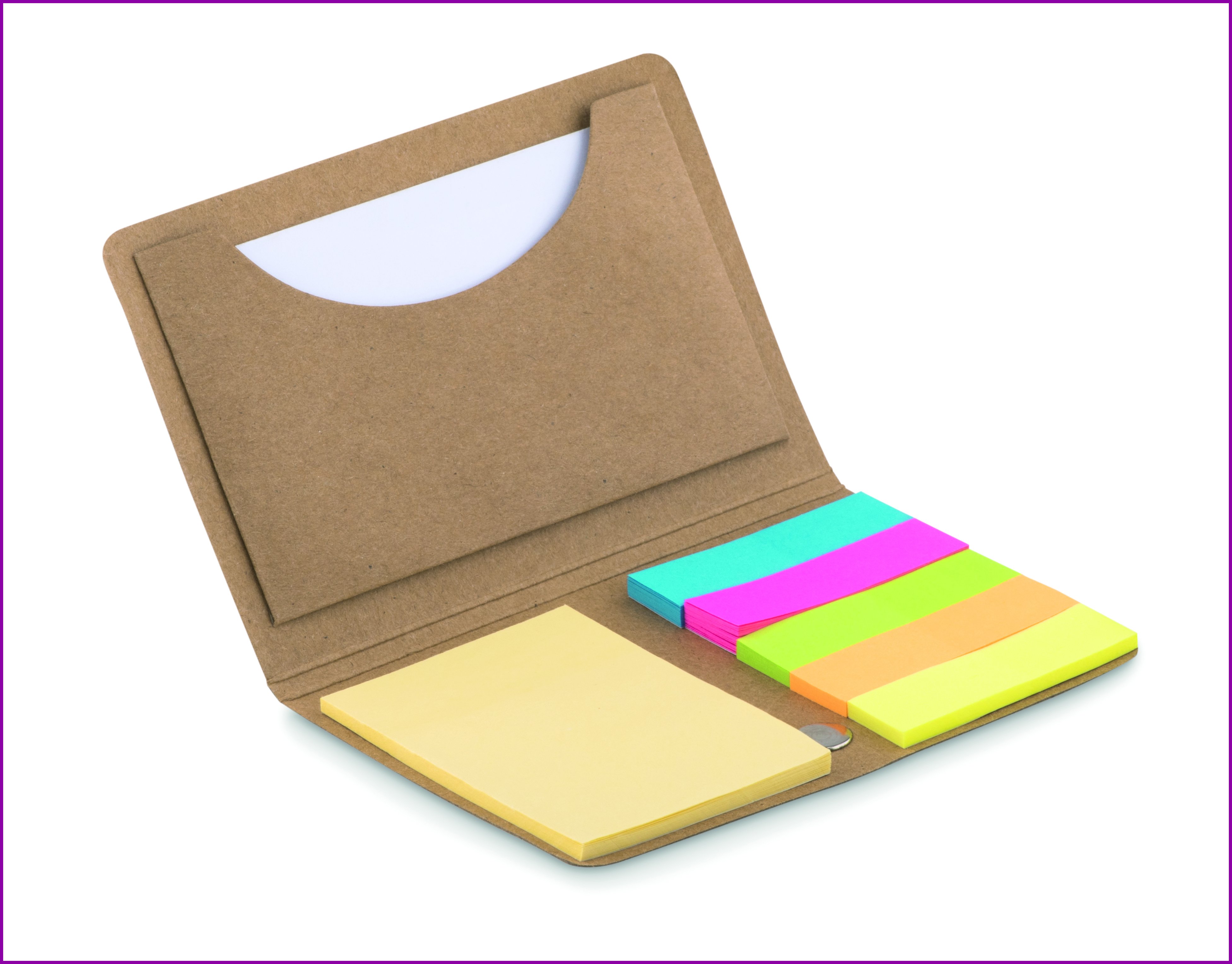 Voimapaperista valmistettu käyntikorttitasku, elastisella sulkuhihnalla. Sisältää keskikokoisen keltaisen muistilappulehtiön tarrapinnalla ja 5 eri väristä indeksi tarralappua.