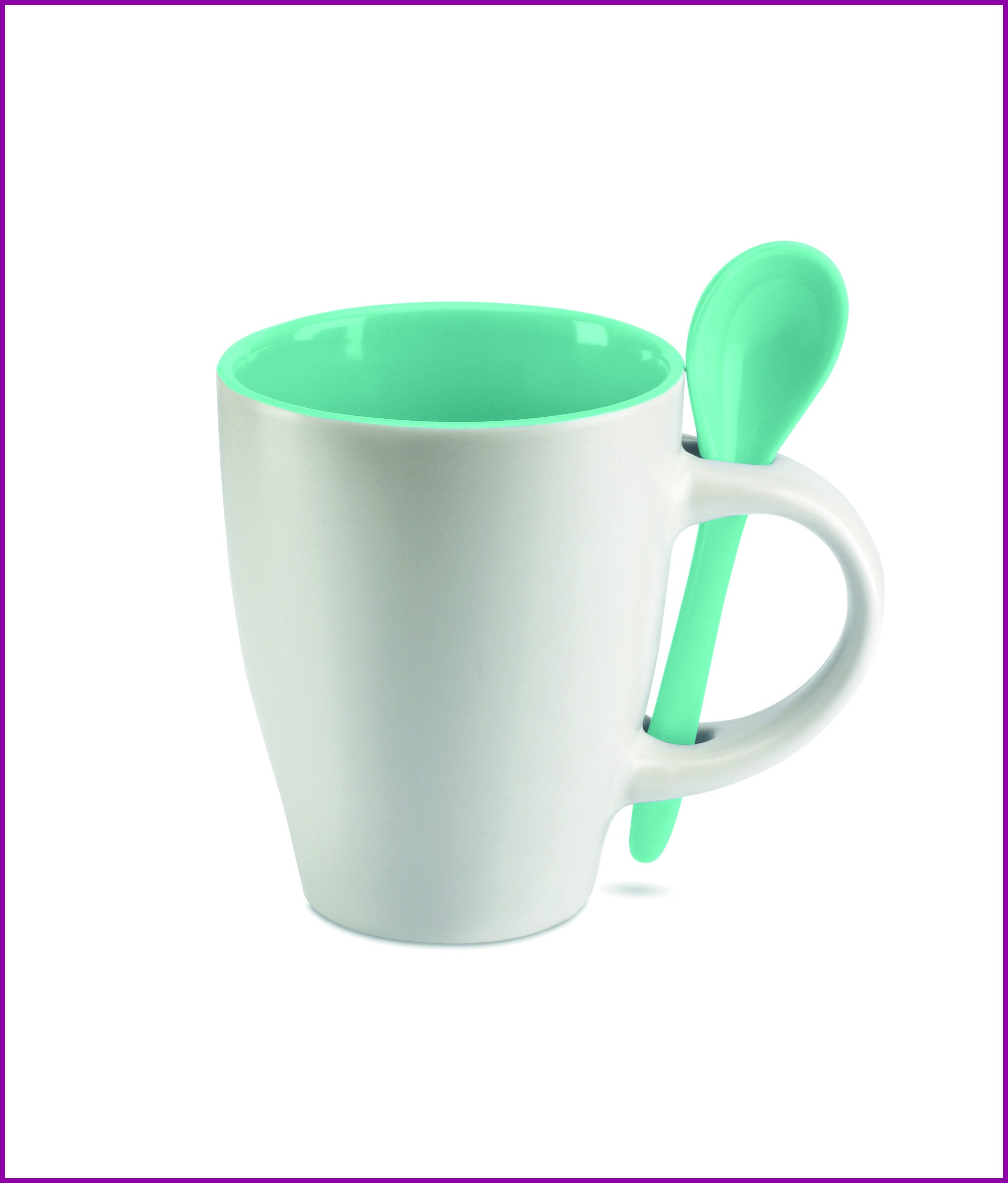 Kaksivärinen keraaminen kahvimuki 250 ml, sisältää lusikan. Tampopainatus kestää vain käsinpesun, keraaminen painatus on konepesun kestävä. Mikroaaltouunin kestävä, yksittäispakattuna 11,5x10,5x9,3cm laatikkoon.