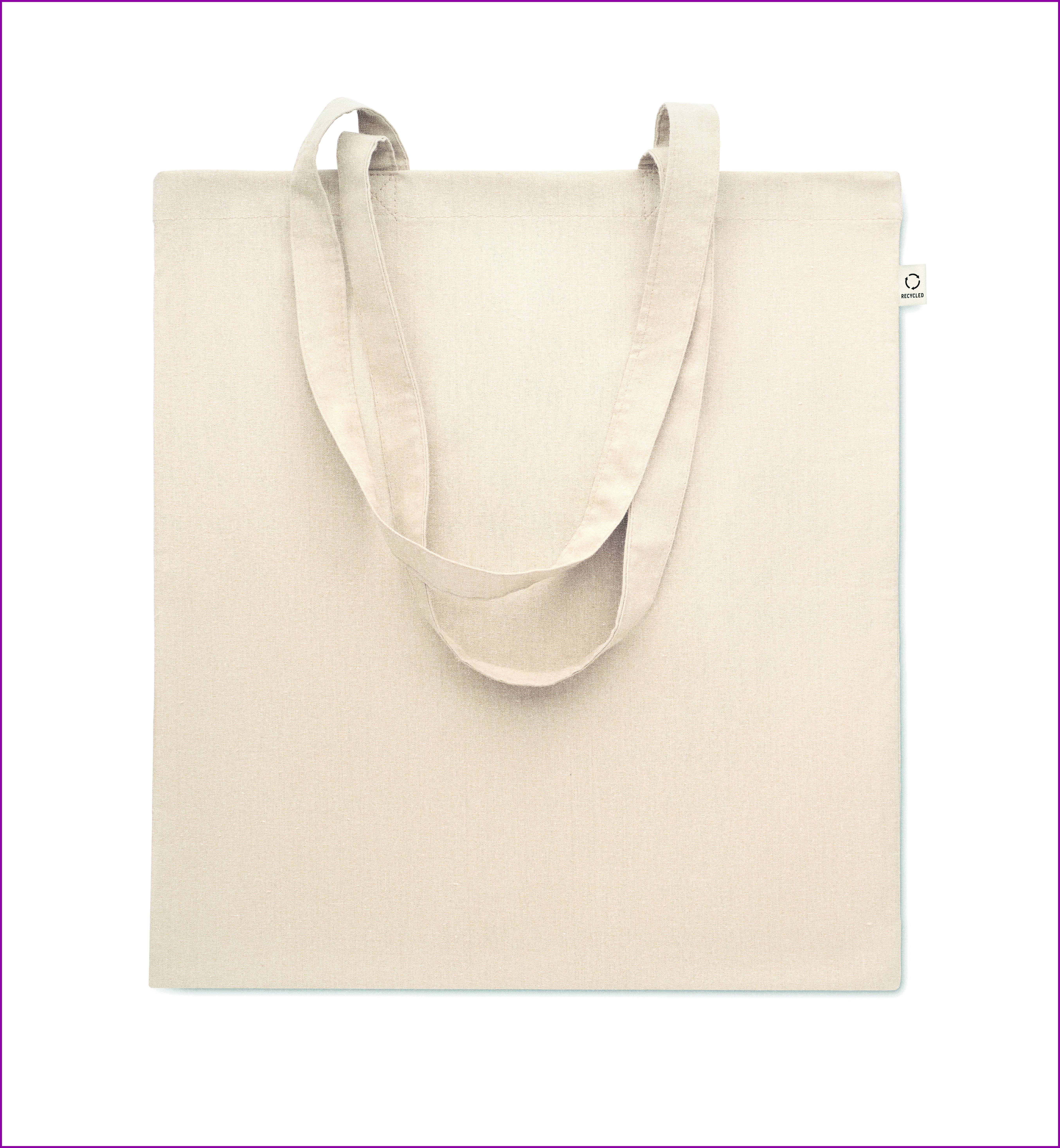 Kierrätetty ostoskassi (70 % kierrätettyä puuvillaa ja 30 % RPET) pitkällä kahvalla. 140 g/m². Tuote voi kutistua painatuksen jälkeen.