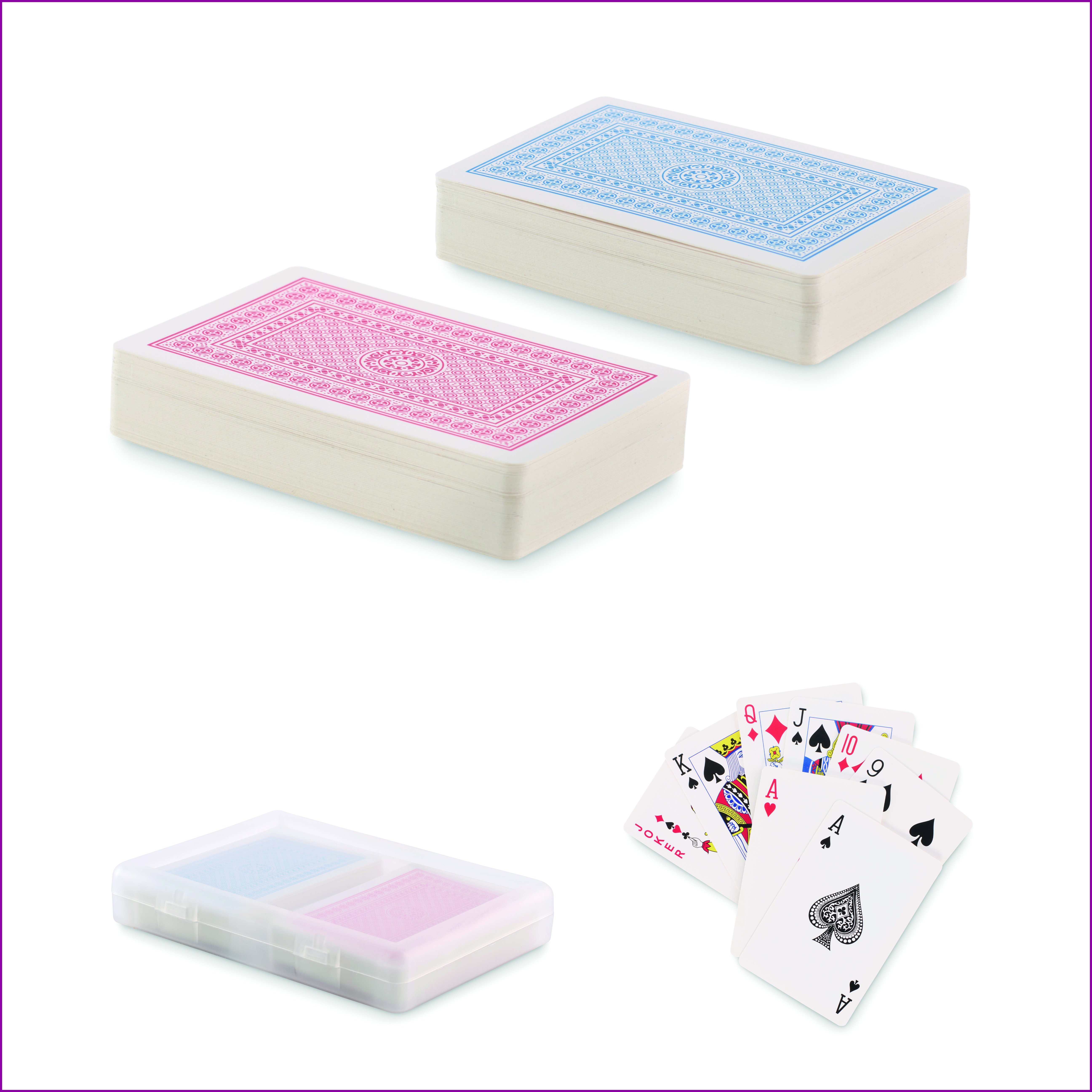 2 klassisen pelikorttipakan setti kierrätetyssä PP-kotelossa. 2x54 korttia (punainen ja sininen).