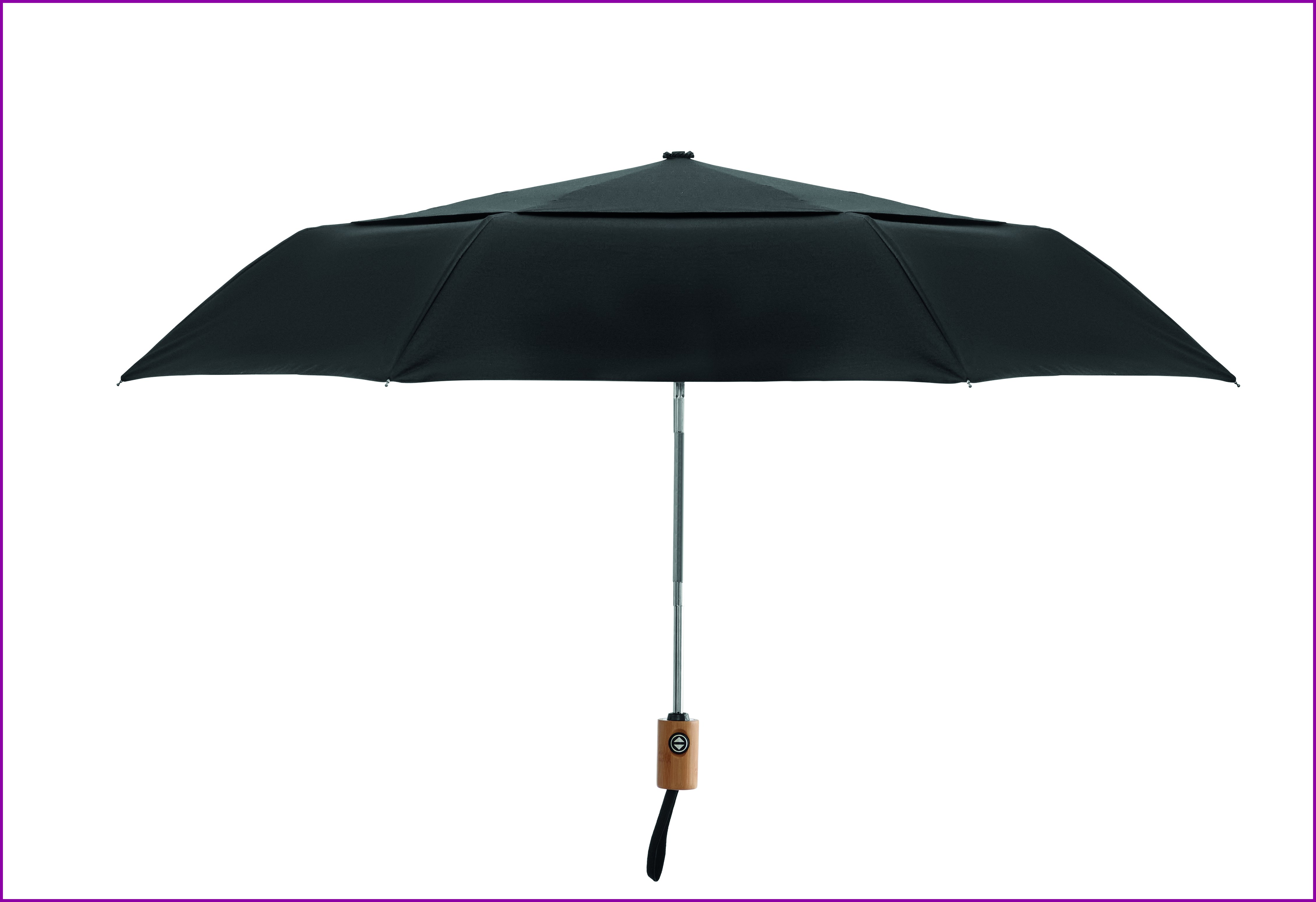 21 tuuman kahteen osaan taittuva, automaattisesti avautuva ja tuulenpitävä sateenvarjo 190T-polypuuvillamateriaalista. Täysalumiininen varsi, kärjet ja bambukahva. Mustat lasikuituruoteet. Mukana suojapussi. Automaattinen sulkeminen.