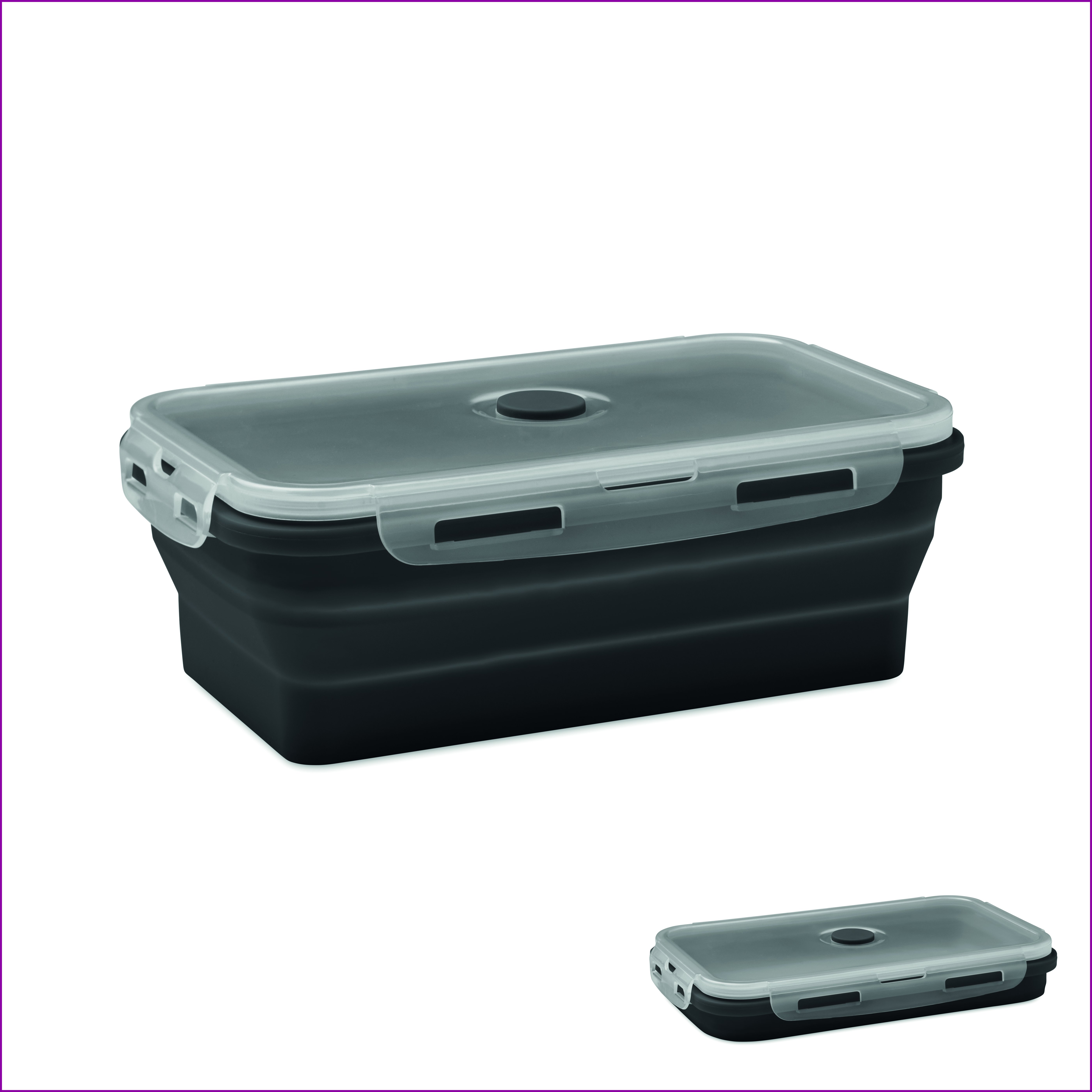 Kokoontaitettava silikoninen lounasrasia, jossa on PP-kansi ja silikoniventtiili. Tilavuus: 1200 ml.