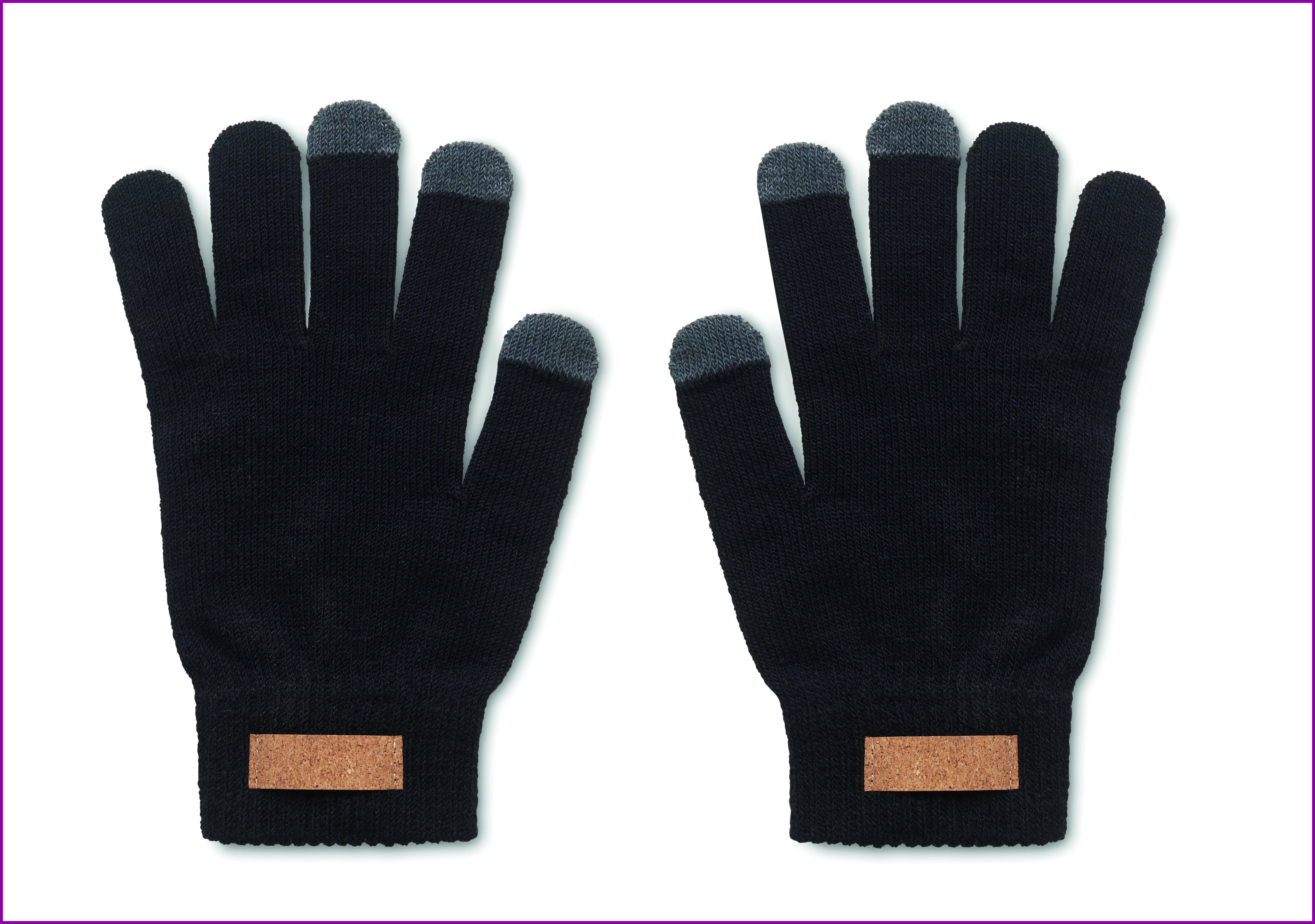 Älypuhelimen kosketusnäyttökäsineet RPET-polyesteriä. Käsineissä on korkkia oleva merkki merkkausta varten.