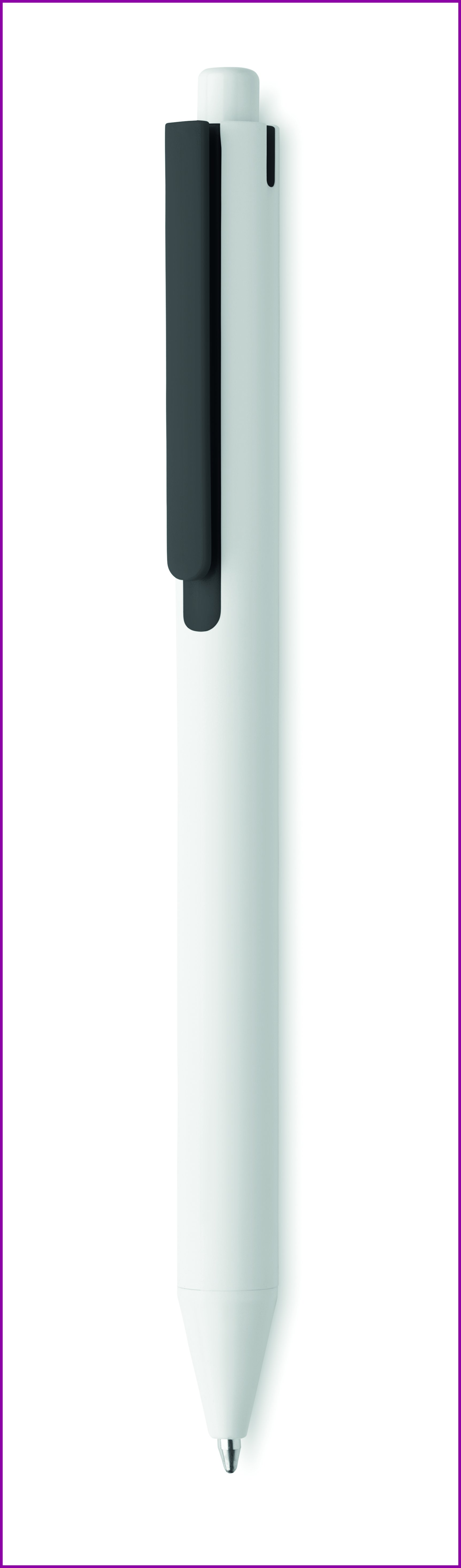 Kuulakärkikynä painonapilla kierrätetystä ABS-materiaalista. Valkoinen runko ja kontrastivärinen klipsi, sininen muste.