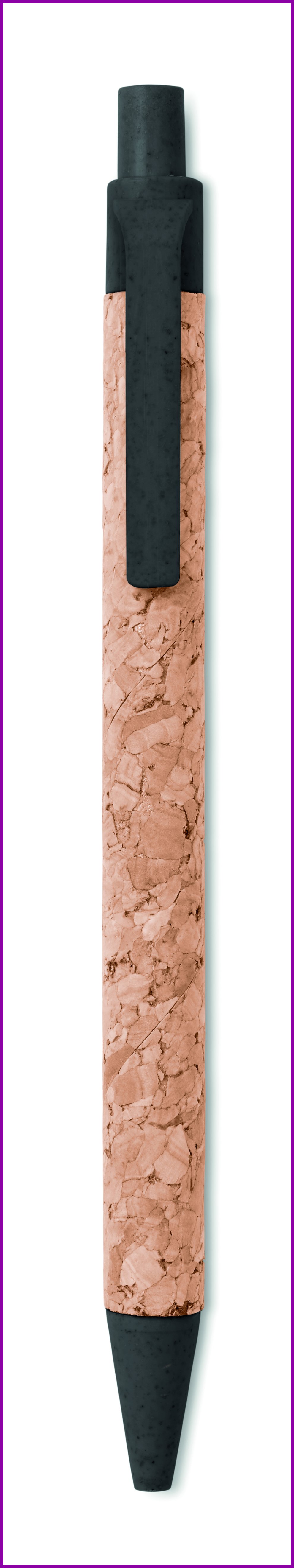 Kuulakärkikynä sinisellä musteella ja korkki rungolla, ympäristöystävällisillä vehnäolki (50%)/ABS-muovi (50%) osilla. Korkki on luonnonmateriaali, strukturaalinen laatu ja pinnan huokoisuus voi aiheuttaa eroavaisuuksia tuotteissa painatuksen jälkeen.