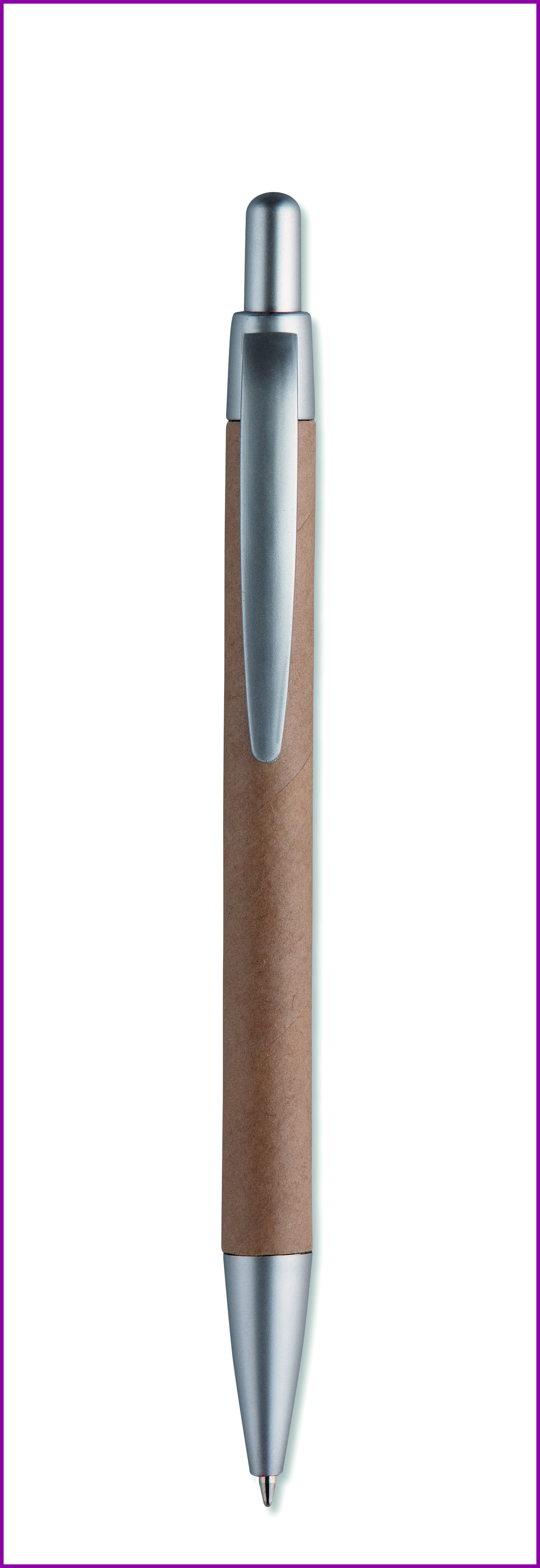 Painomekanismilla toimiva kuulakärkikynä sinisellä musteella ja kartonkirungolla. Kärki ja klipsi ABS-muovia.