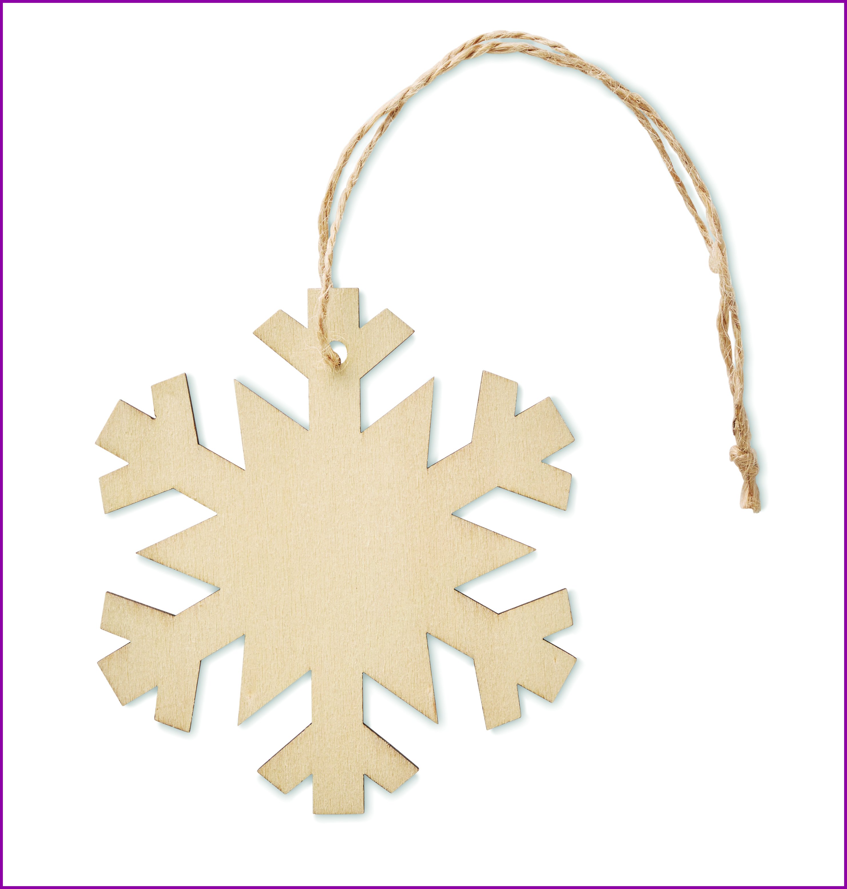 Puinen MDF lumihiutaleen muotoinen kuusenkoriste juuttilankaripustimella. Luonnollisen materiaalin (MDF) vuoksi, tuotteiden värissä/ koossa saattaa olla erinäisyyksiä ja tämä voi vaikuttaa painatuksen lopputulokseen.
