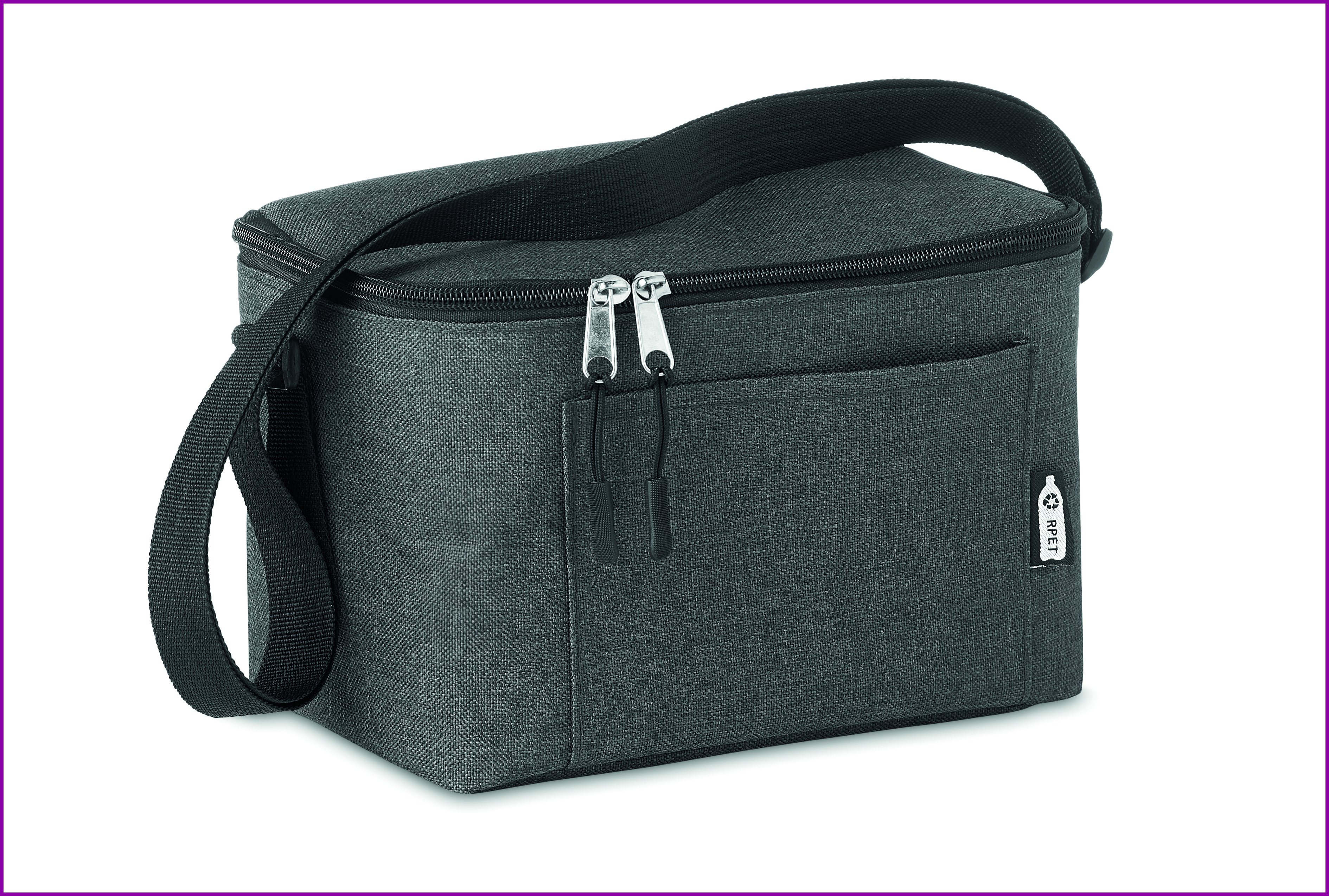 3 litran 2- sävyinen 600D RPET kylmälaukku 6 tölkille, edessä tasku. Eristysmateriaalina 0,15mm EVA ja 3mm vaahtomuovia.