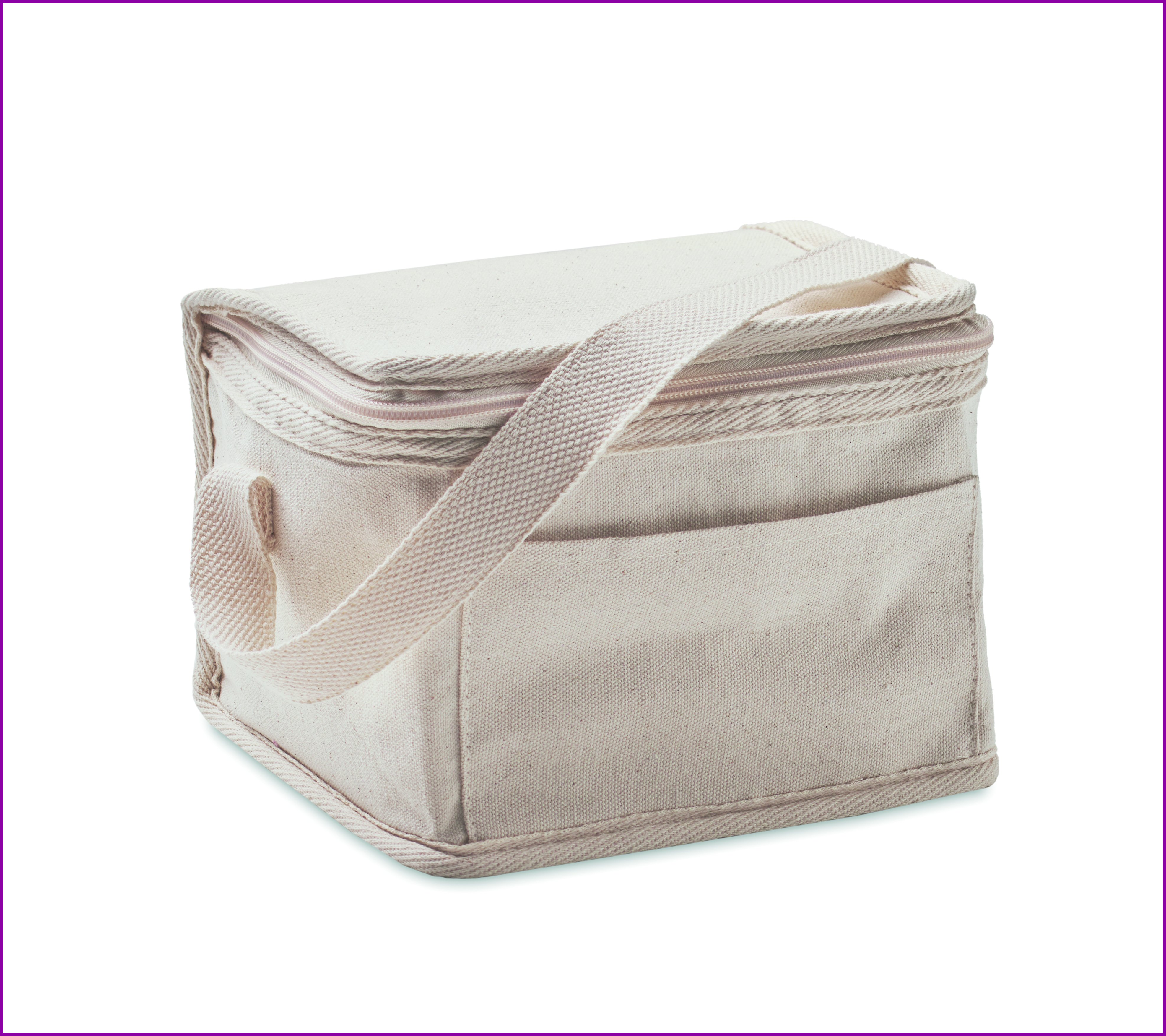 Puuvillainen 280 gr/m² kylmälaukku, jossa on etutasku. 3 mm eristävä alumiinilaminoitu folio. Tilavuus 3 L.