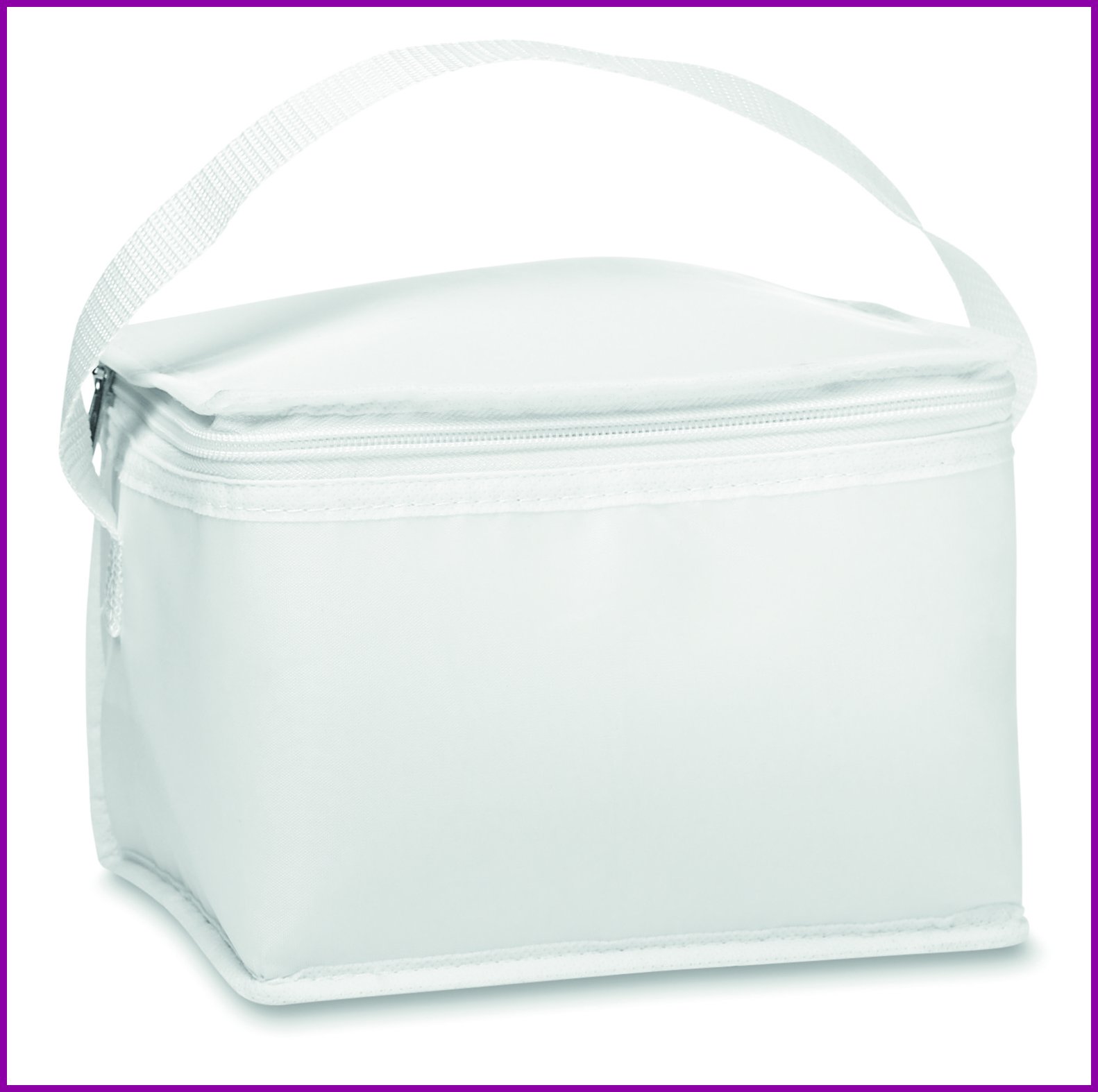 210 polyesterinen kylmälaukku 6 tölkille, kuitukangasta 80gr / m² sisäpuoli alumiinifoliolla päällystettyä vaahtomuovia.