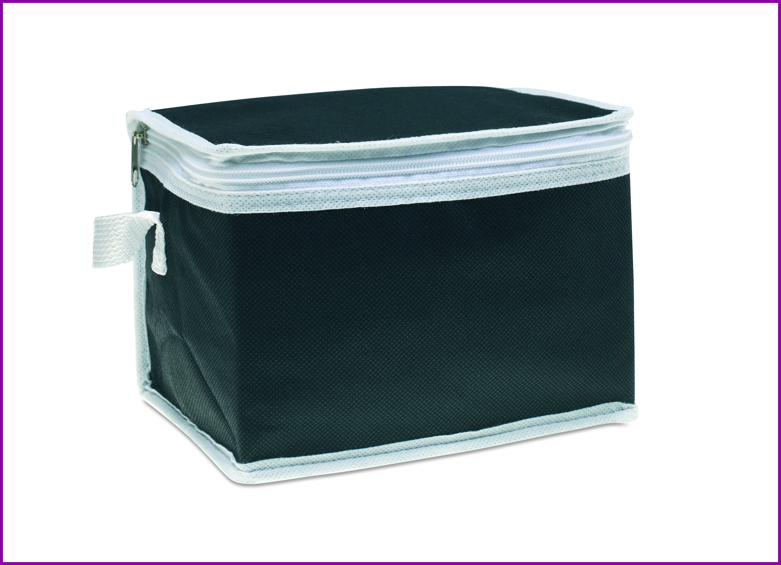 Alumiinifolioinen kylmälaukku, tilaa 6 tölkille. Ulkoinen materiaali kuitukangasta, valkoisilla reunuksilla. 80 g / m².