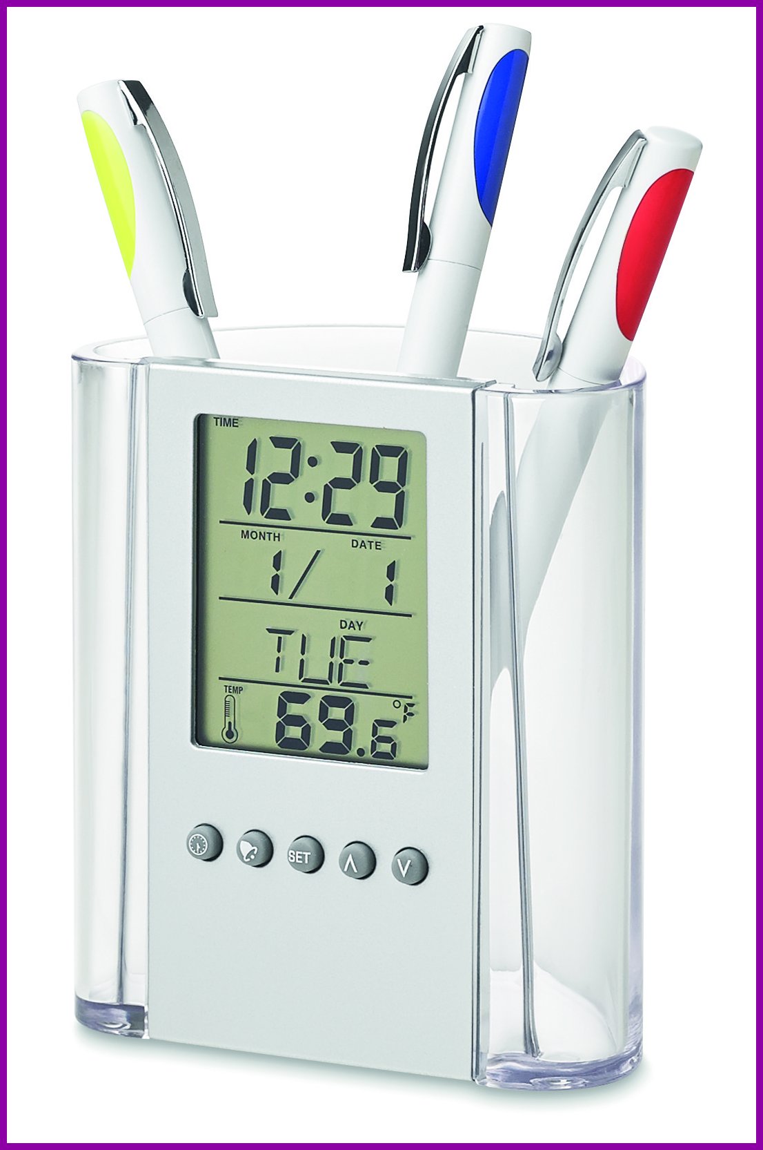 Kynäteline kalenterilla, herätyskellolla ja lämpömittarilla.