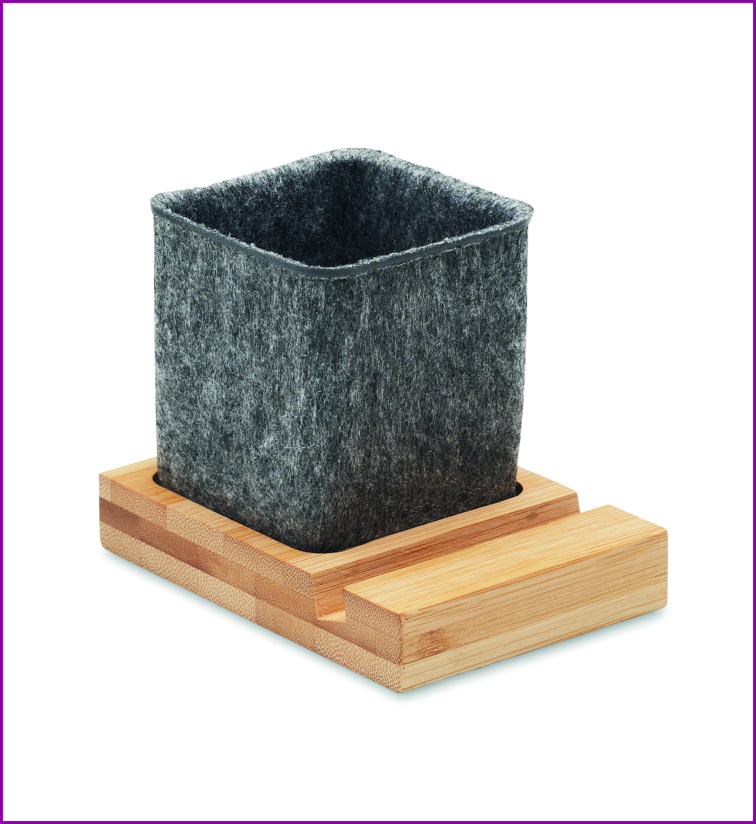 RPET-huopakynäteline, jossa on bambupohja ja jalustainen puhelinteline.