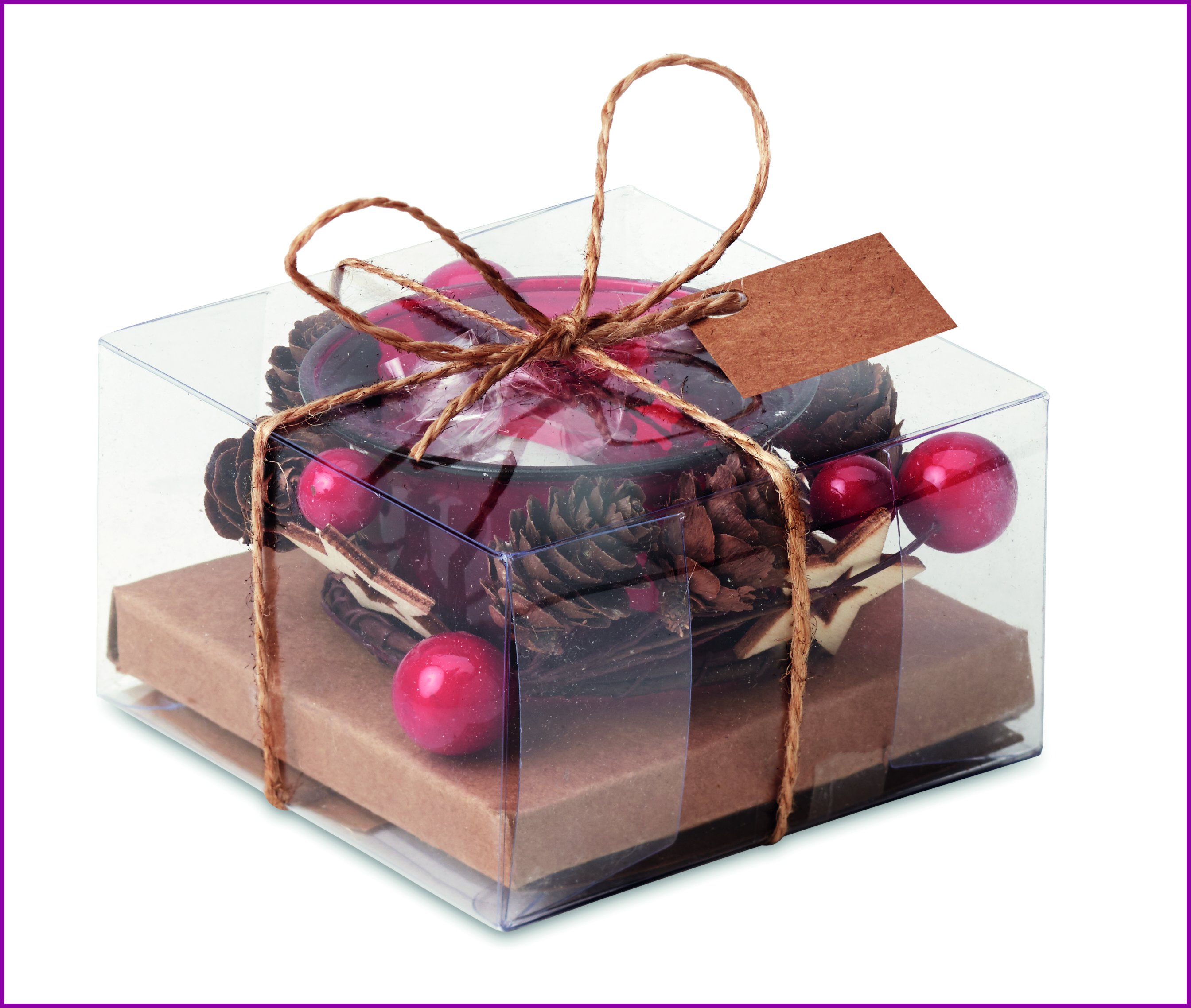 Lasinen kynttilänalunen koristeiden ympäröimänä. Pakattuna kartonki/ PVC- lahjapakkaukseen.
