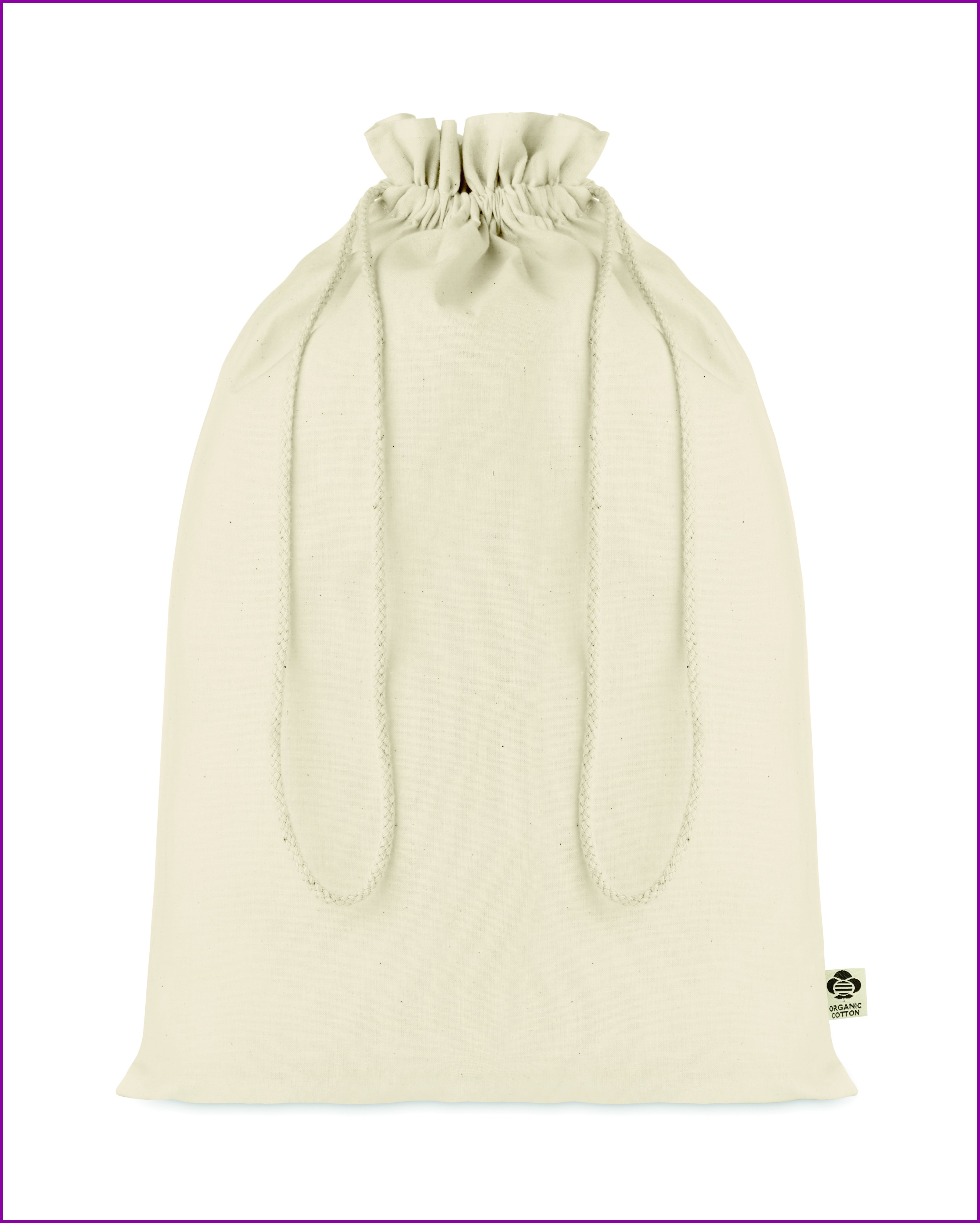 105 gr/m² suuri orgaanisesta puuvillas valmistettu pussi, kiristysnauhalla.