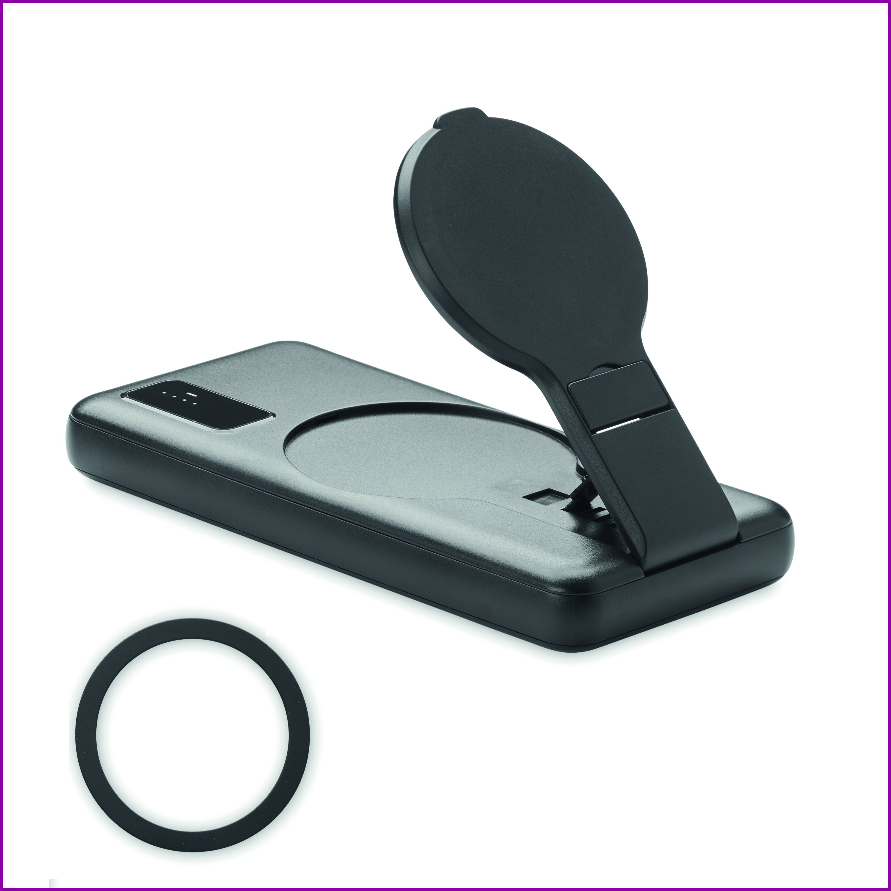 Magneettinen langaton laturi (15 W) ja varavirtalähde (10000 mAh) ABS- materiaalista, jossa on magneettinen puhelinteline. Tulo: Micro B, Type- C. Lähtö 2x USB-A Tulo/lähtö: Type-C. Lähtö: Lähtö: DC 9V/1.66A (15W) ihanteellinen pikalataukseen. Sis