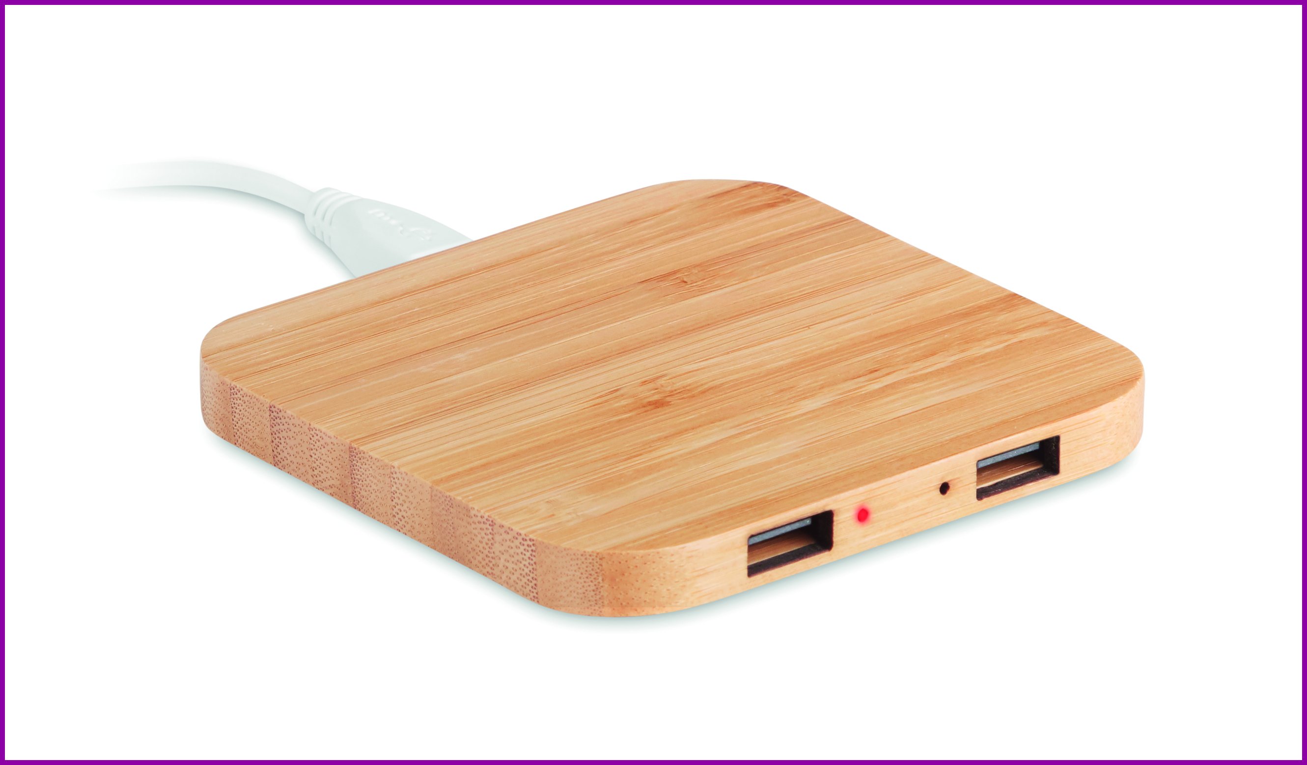 Langaton laturi bambusta, 2 USB 2.0 keskittimellä. Lähtövirta DC5/1A (5W) . Luonnollisen materiaalin (bambu) vuoksi, tuotteiden värissä/ koossa saattaa olla erinäisyyksiä ja tämä voi vaikuttaa painatuksen lopputulokseen.