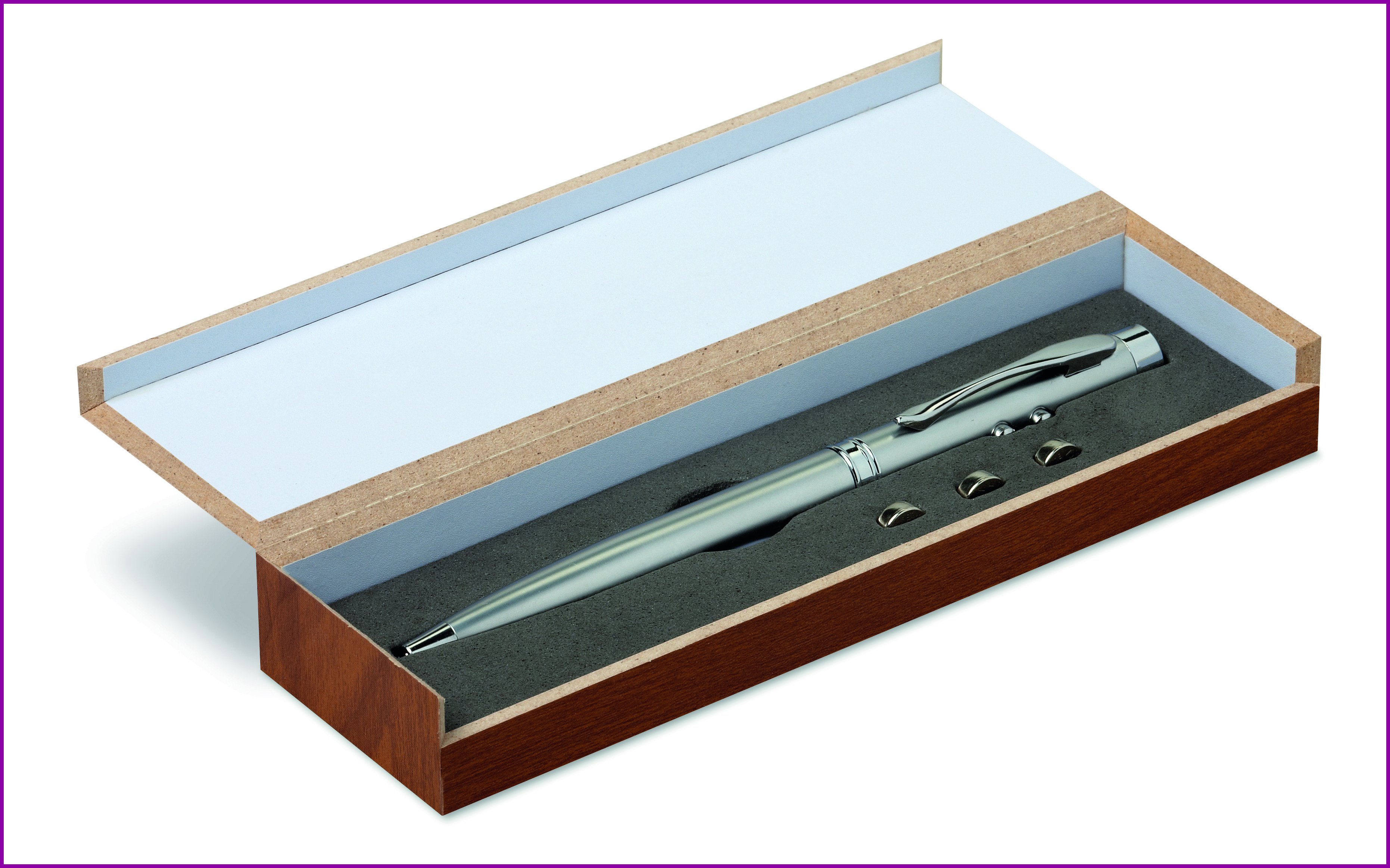 Monitoimi kuulakärkikynä sinisellä musteella, sisältää valkoisen LED-valon ja punaisen laserosoittimen. Pakattuna puulaatikkoon, sisältää kolme LR41 patteria.