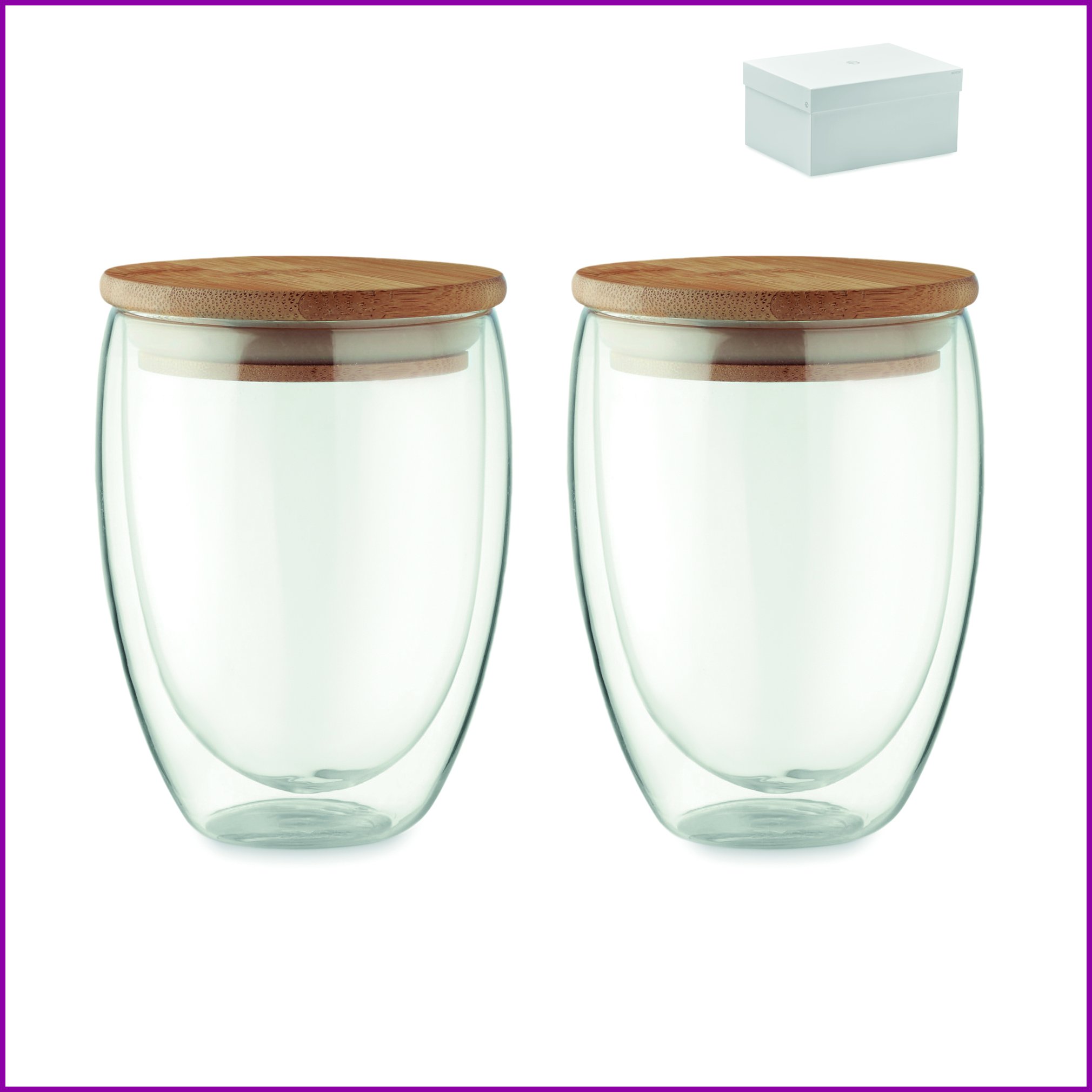 Kuumalasi kaksiseinäisestä borosilikaattilasista. Lasissa on bambukansi silikonirenkaalla. Tilavuus 350 ml. Kahden lasin setti, pakattu laatikkoon.