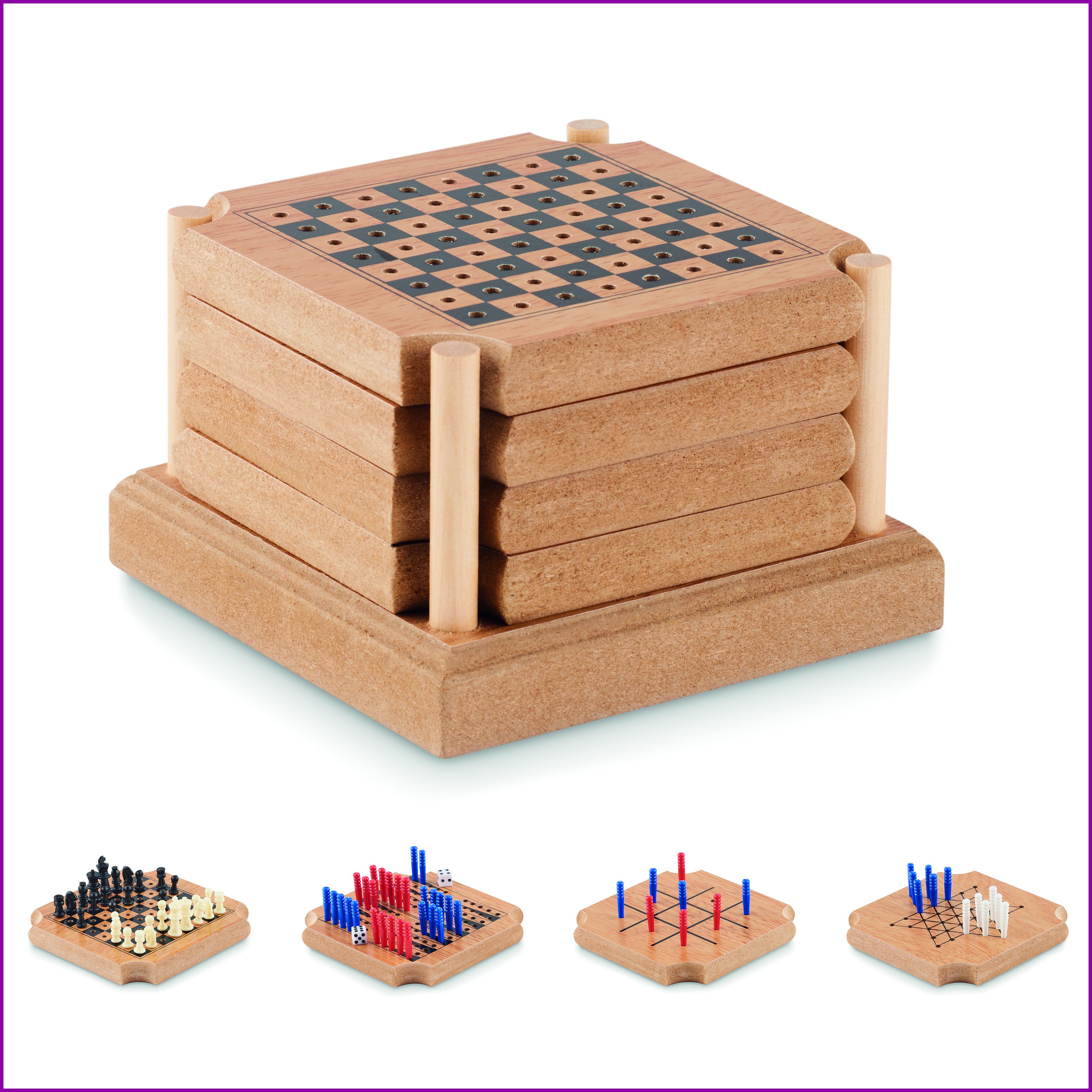 MDF ja korkista valmistettu lasinalunen pelisetti, sisältää 4 eri peliä tic-tac-toe, backgammon, shakki ja Kiinalainen tammi.Korkki on luonnonmateriaali, strukturaalinen laatu ja pinnan huokoisuus voi aiheuttaa eroavaisuuksia tuotteissa painatuksen jälkeen.