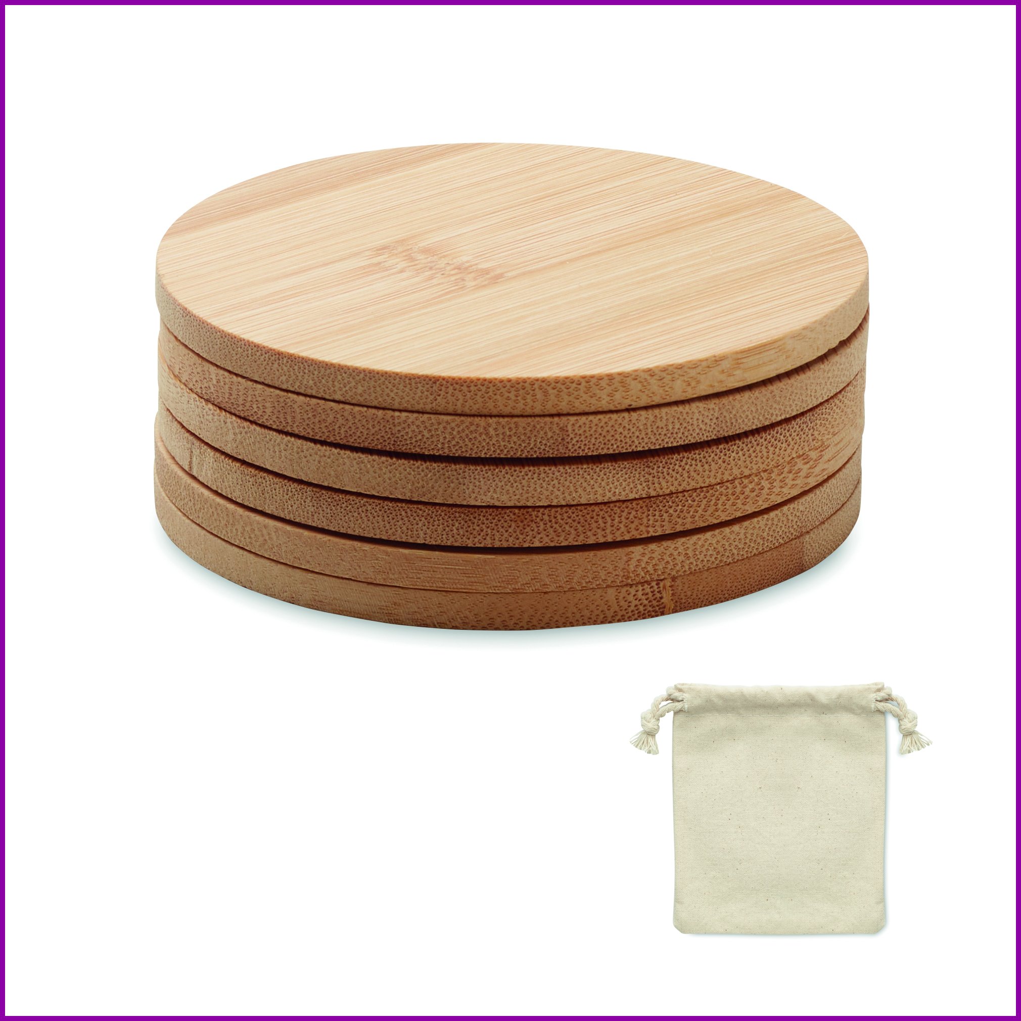 6 kpl pyöreitä bambusta valmistettuja lasinalusia, pakattuna puuvillaiseen pussiin.