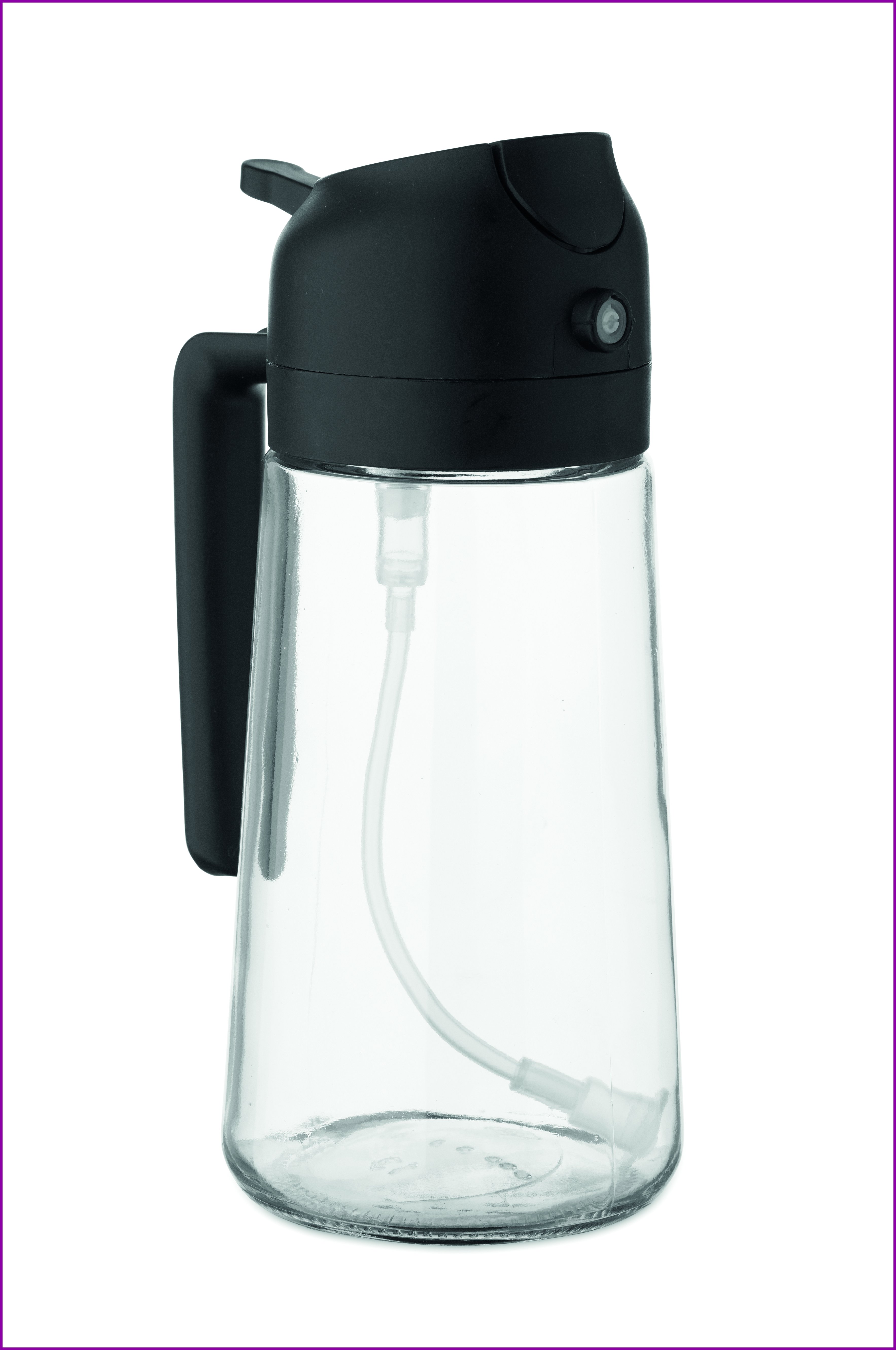 2-in-1 lasinen öljyannostelija ja sumutin, jossa PP-kansi ja PE-pilli. Tilavuus 450 ml.