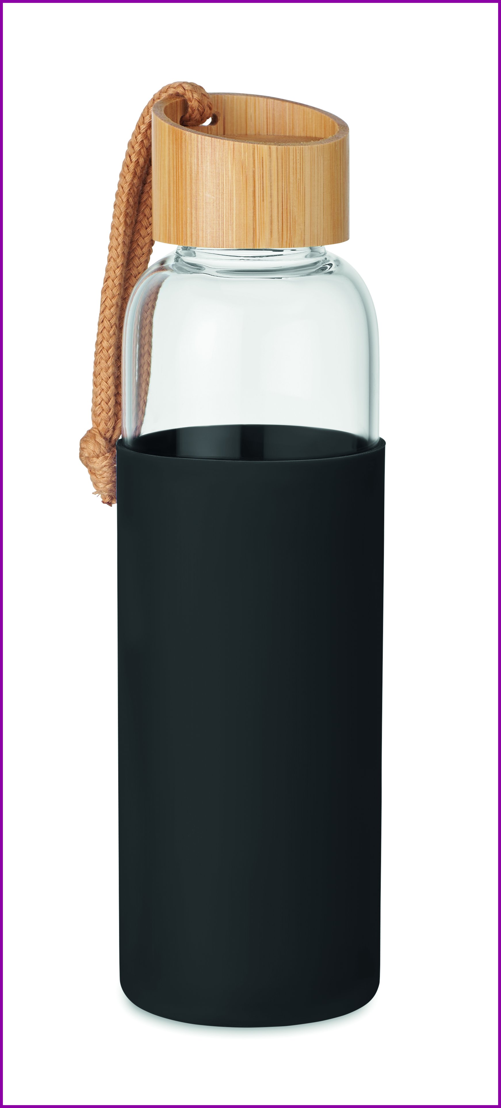 Lasipullo silikonipussissa. Pullossa on bambukorkki ja puuvillainen rannelenkki. Ei sovellu hiilihapollisille juomille. Vuotamaton. Tilavuus 500 ml.