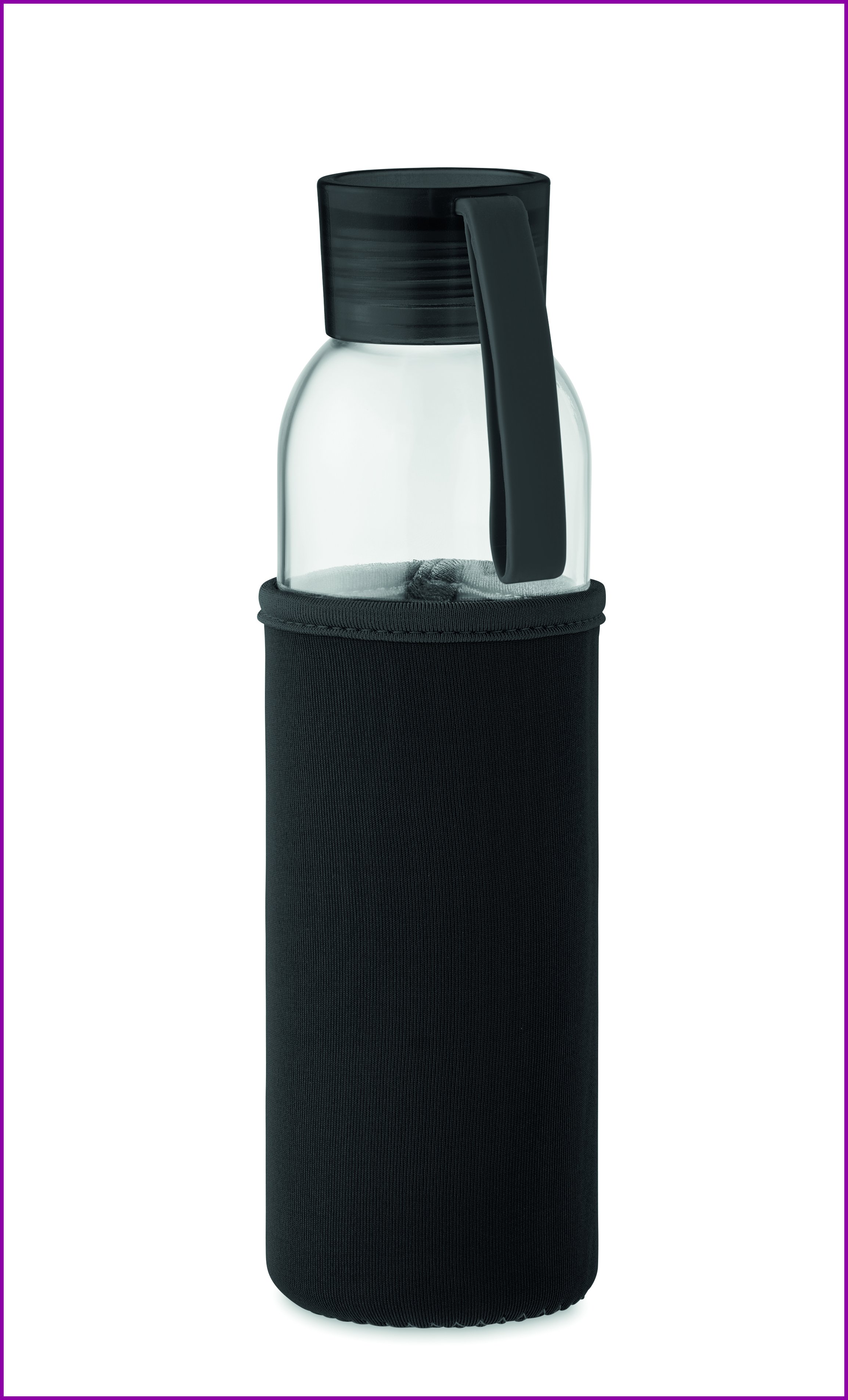 Kierrätyslasipullo, jossa neopreenipussi ja PP-korkki silikoniripustimella. Vuotamaton. Tilavuus: 500 ml.