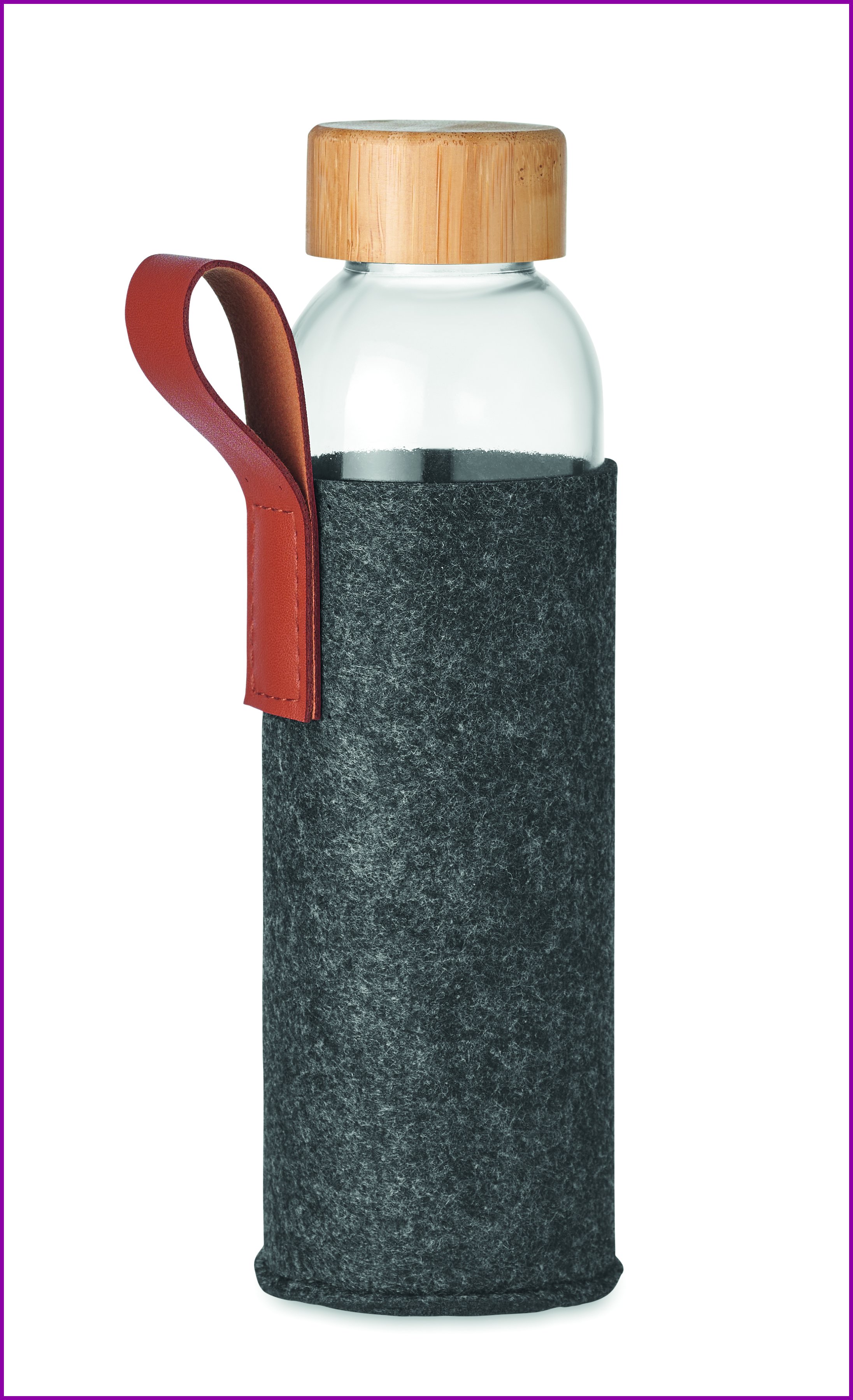 Lasipullo RPET RPET-huopakannella. Pullossa on bambukorkki ja pipustuslenkki PU:ta. Tilavuus 500 ml.