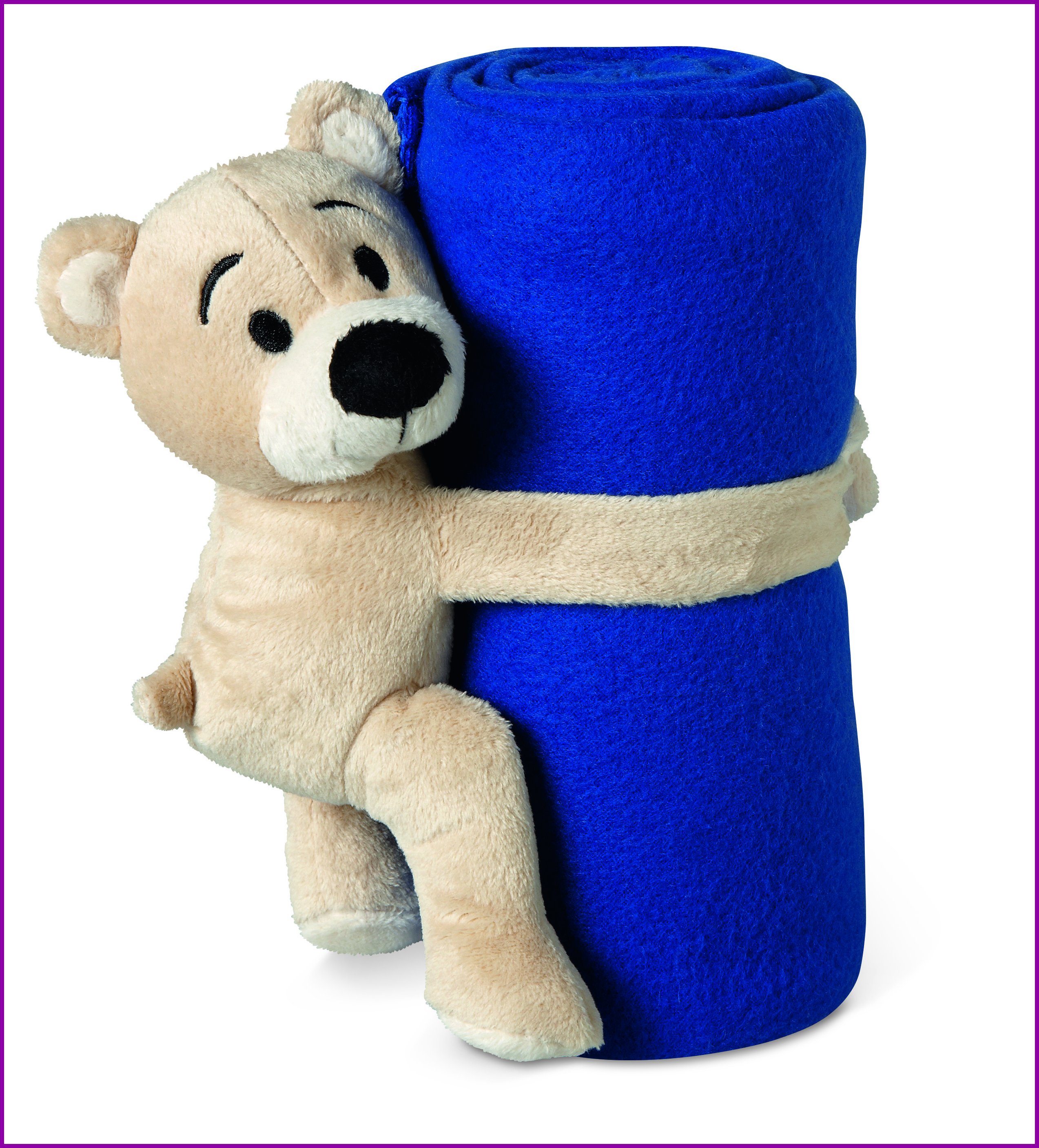 Lasten fleecehuopa, nallekarhulla pitää peiton rullalla kiinnitysnauhakäsillä.