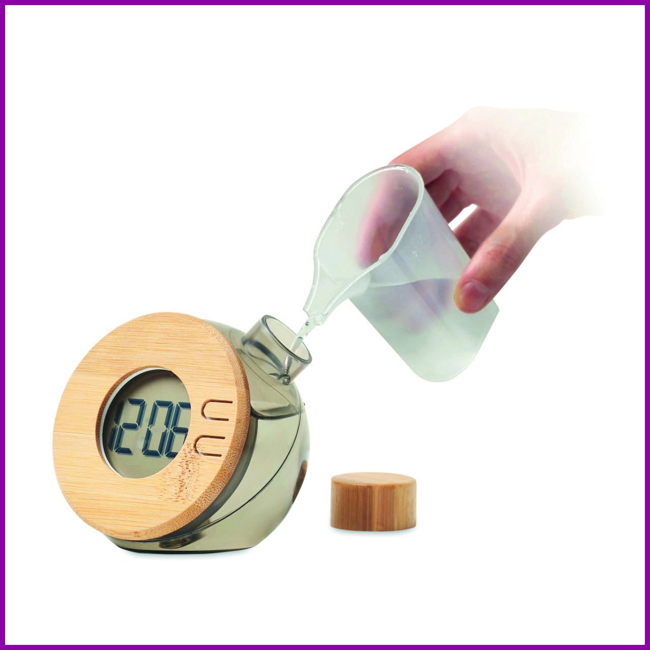 Suuri LCD-seinä- tai pöytäkello bambuyksityiskohdilla. Laitteen käyttöön tarvitsee vain lisätä vettä ja 3 g suolaa. Muistin ylläpitämiseksi mukana 1 LR41-paristo. Bambuyksityiskohdat ovat luonnontuote, joten värissä ja koossa voi esiintyä pieniä vaihteluita, mikä voi vaikuttaa lopulliseen ulkonäköön.