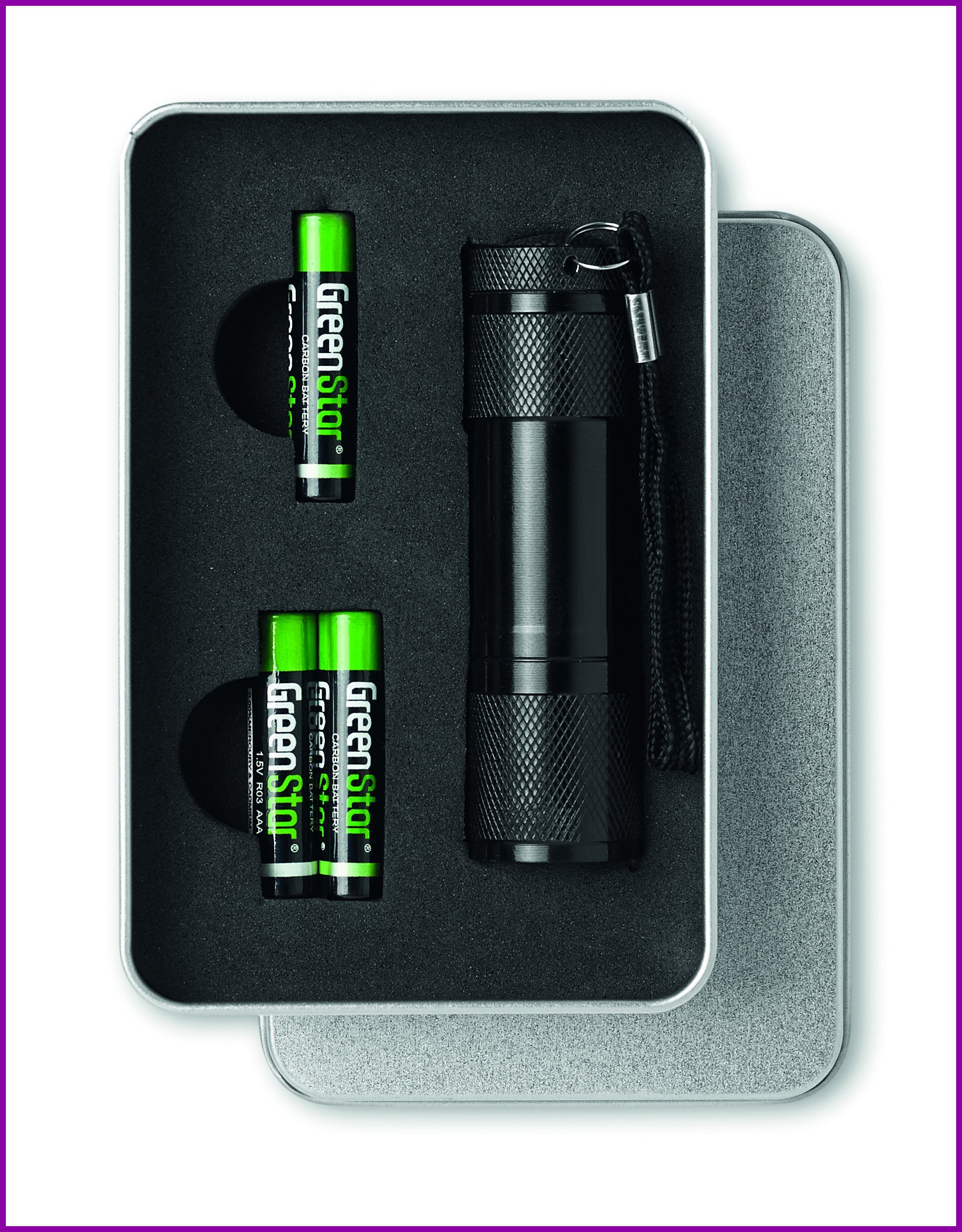 9 LED alumiinitaskulamppu, sisältää 3 x AAA-paristoa ja irrotettavan hihnan. Pakattuna peltilaatikoon.