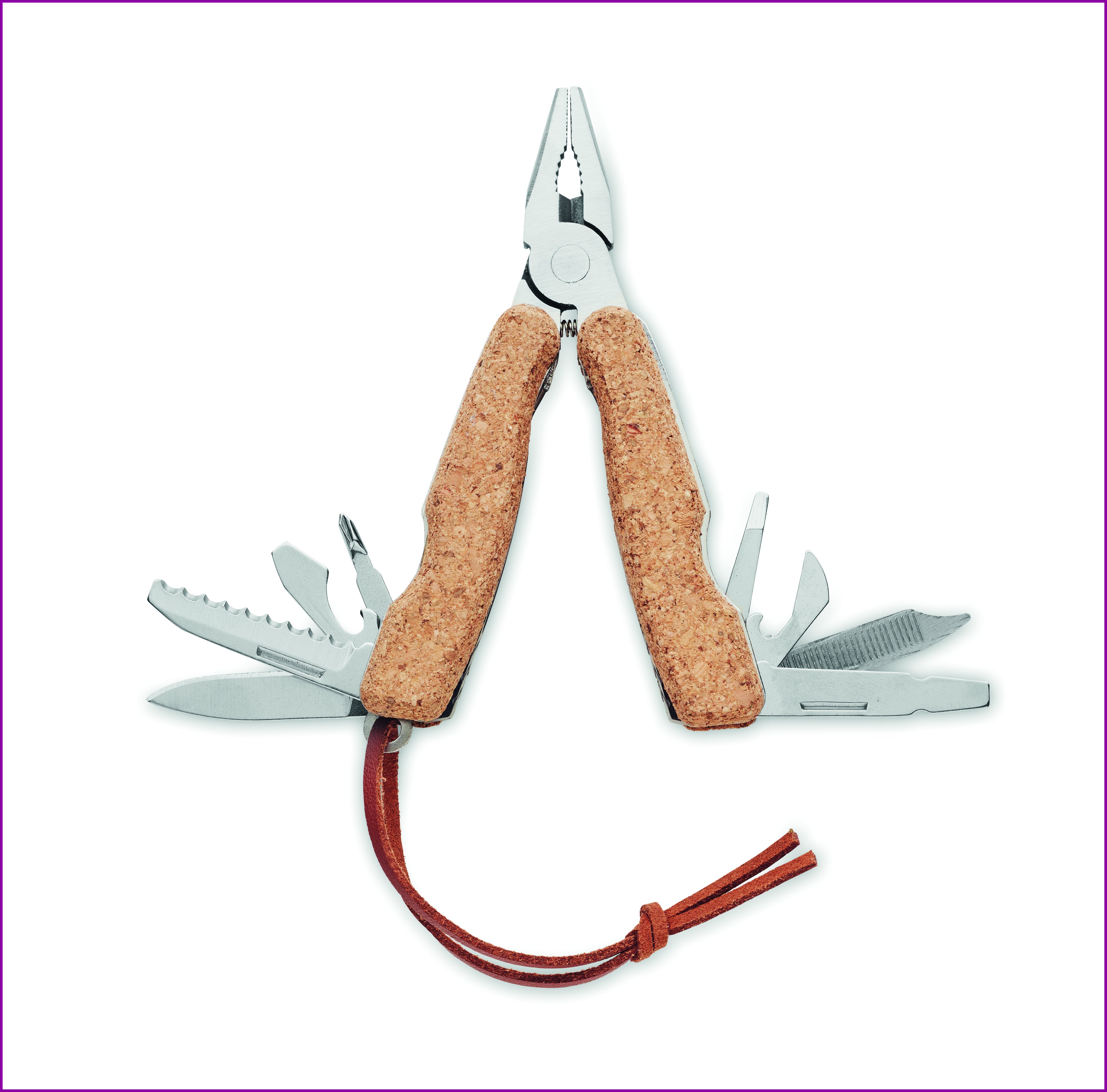 Ruostumattomasta teräksestä valmistettu monikäyttöinen taskuveitsi, jossa on korkkisuojus ja PU-nauha. Sisältää: pihdit, 2 avaajaa, ruuvimeisseli Philipsin terillä, sahanterät, veitsi, viila ja ruuvimeisseli litteällä terällä.