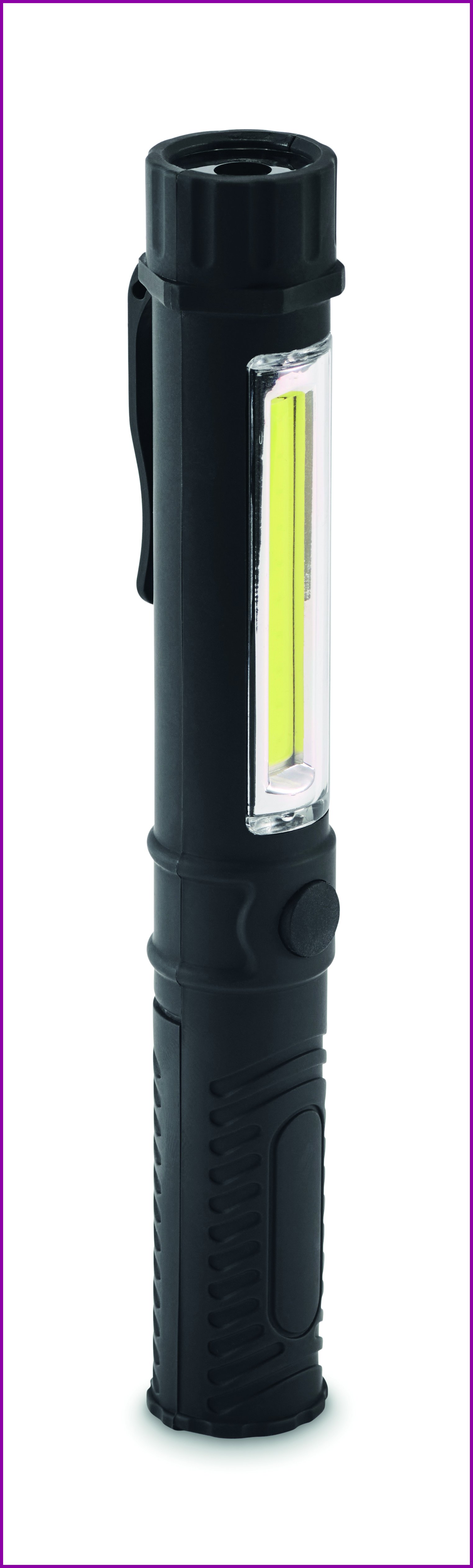Magneettinen LED-työvalo ABS-muovista, jossa klipsi ja sivussa COB-valo. Magneettinen jalusta handsfree-käyttöä varten. Vaatii 3 AAA-paristoa (eivät sisälly toimitukseen).
