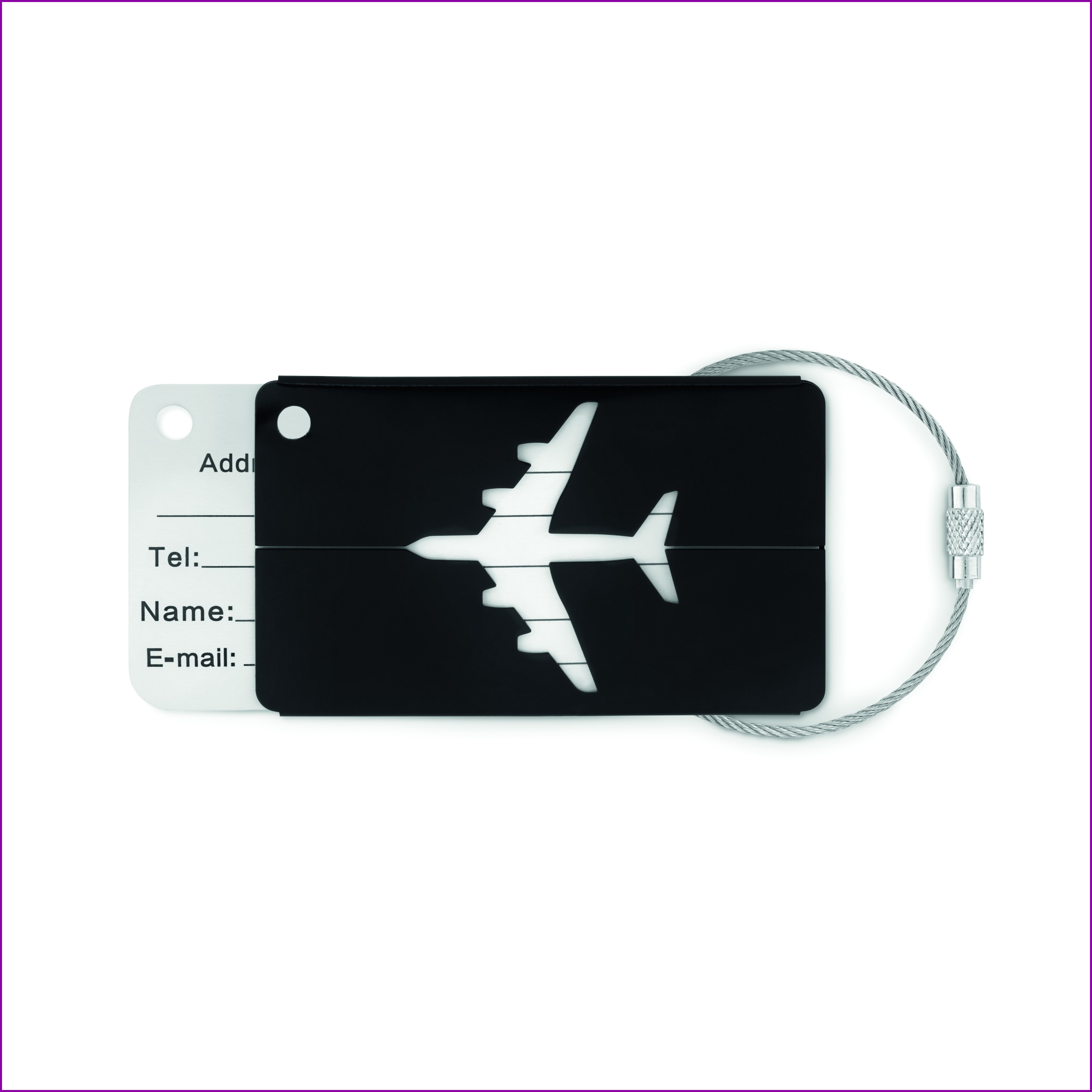 Alumiininen ''lentokone'' matkalaukkutagi, sisältää nimi ja osoite etiketin, metallisen narun.