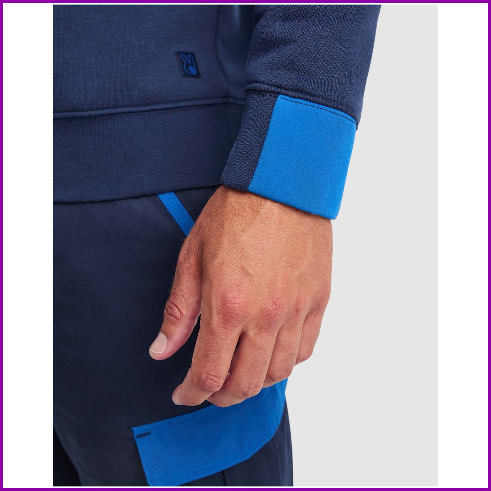 Puolivetoketjullinen svetari väriyhdistelmällä ja korkealla kauluksella. Kauluksen sisäpuolella vahvistetut koristesaumat. Kontrastiväriset olkapäät ja yksityiskohdat. Lyhyet hihat ja helma 1x1-resorikangasta.