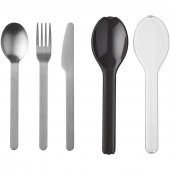 Tyylikäs ja käytännöllinen Ellipse aterinsetti sisältää veitsen, haarukan ja lusikan, jotka on valmistettu ruostumattomasta teräksestä. Ruokailuvälineet säilytetään kompaktissa muovipidikkeessä. Tiskikoneen kestävä.Värit ja Koot