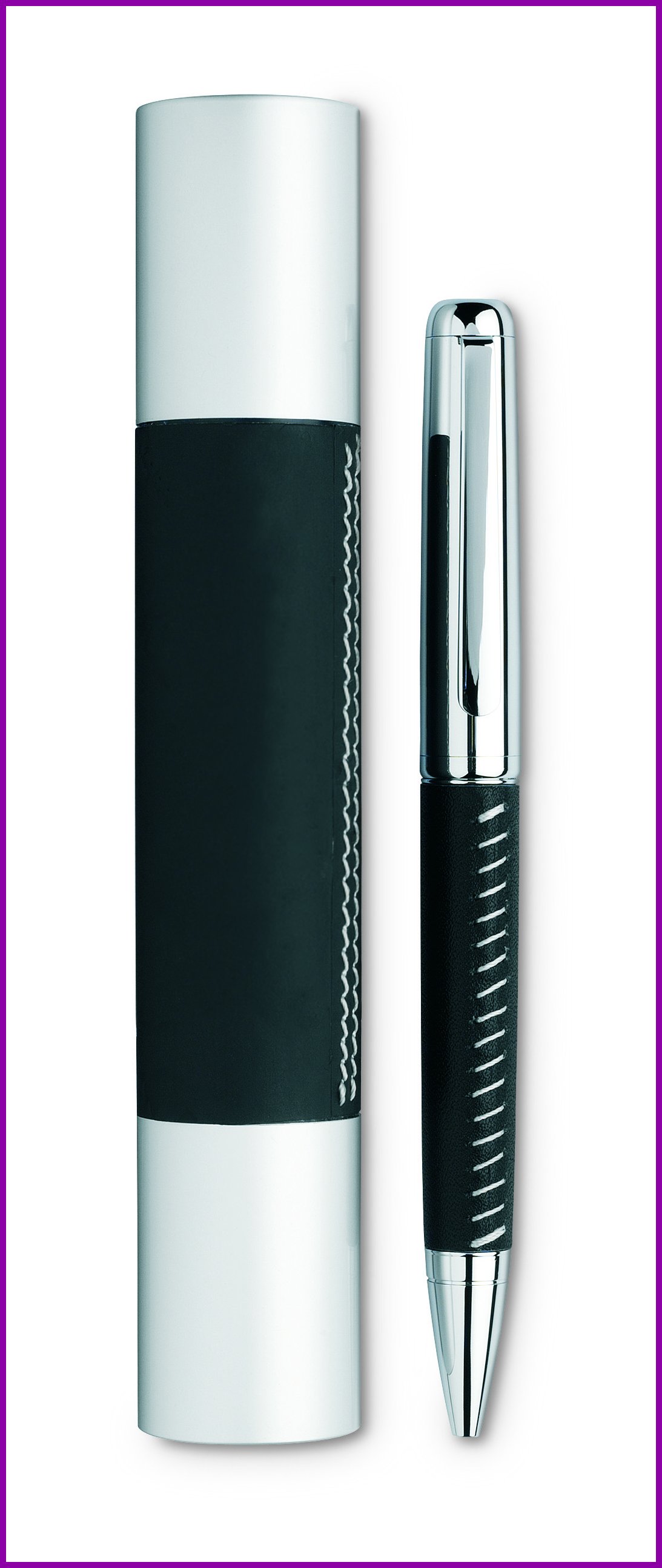 Metallinen kuulakärkikynä hopeakromisella viimeistelyllä ja PU-nahka somisteella, alumiininen säilytyskotelo. Musta muste.