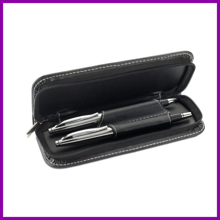 Metallinen kynäsetti PU- nahkakotelossa, kontrasti tikkauksilla. Sisältää kuulakärkikynän sinisellä musteella ja rullakynällä mustalla musteella.