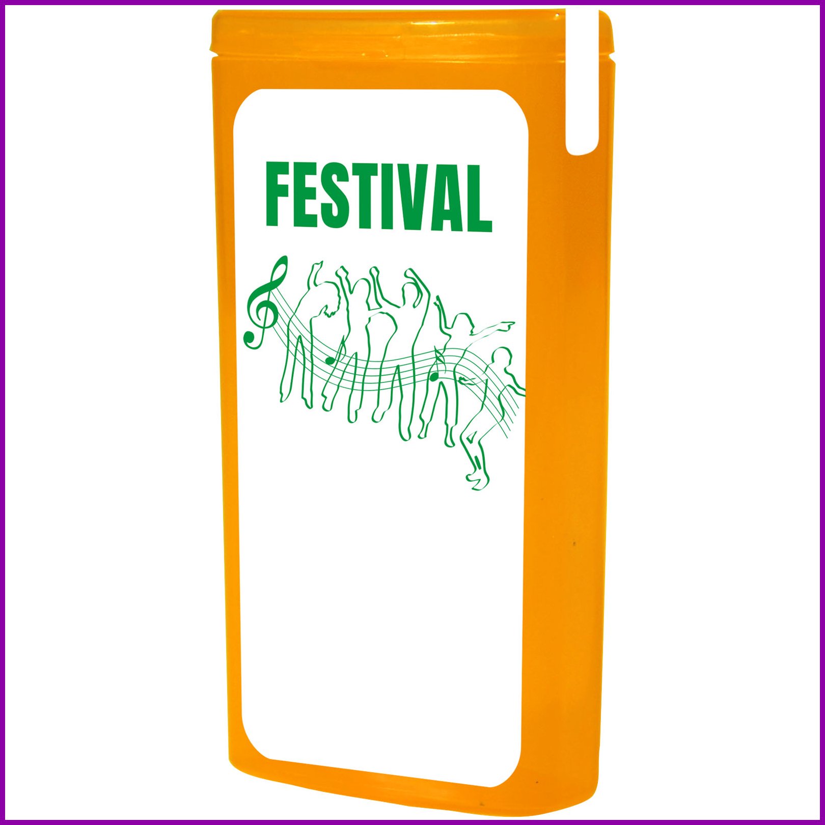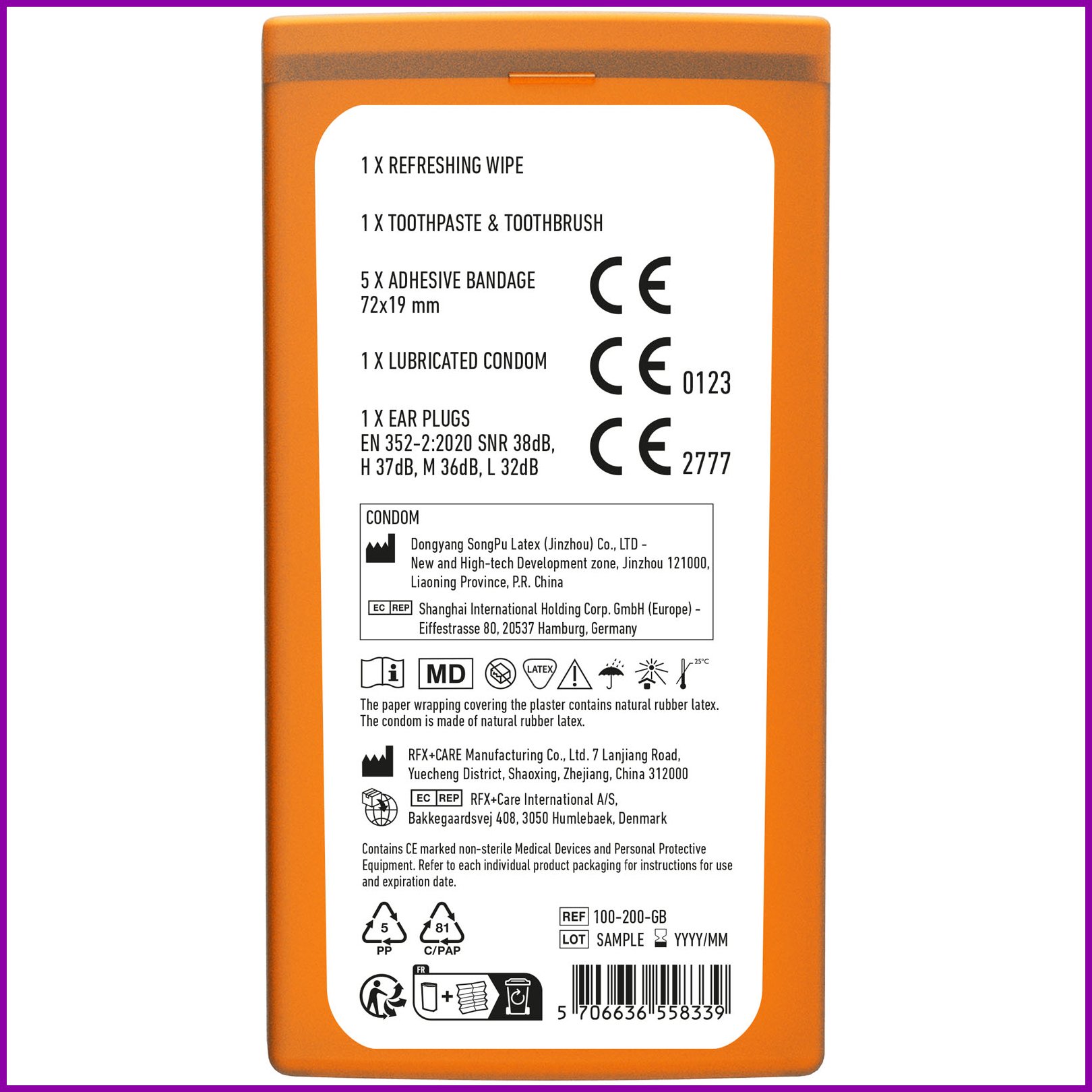 Tämä on ihanteellinen matkasetti festareille: se sisältää kaikki tarvittavat asiat yöpymiseen festareilla tai juhlissa. Pieni pakkaus on helppo säilyttää laukussa tai taskussa. Sisältö: 1 hammasharja, 1 hammastahna, 1 korvatulpat, 1 antibakteerinen geeli, 5 pesunkestävää laastaria ja 1 kondomi. Kaikki pakkauksen sisältämät ensiapu- ja hoitotuotteet täyttävät kaikki soveltuvat EU:n säännökset. Hinta sisältää täysväritulosteen.