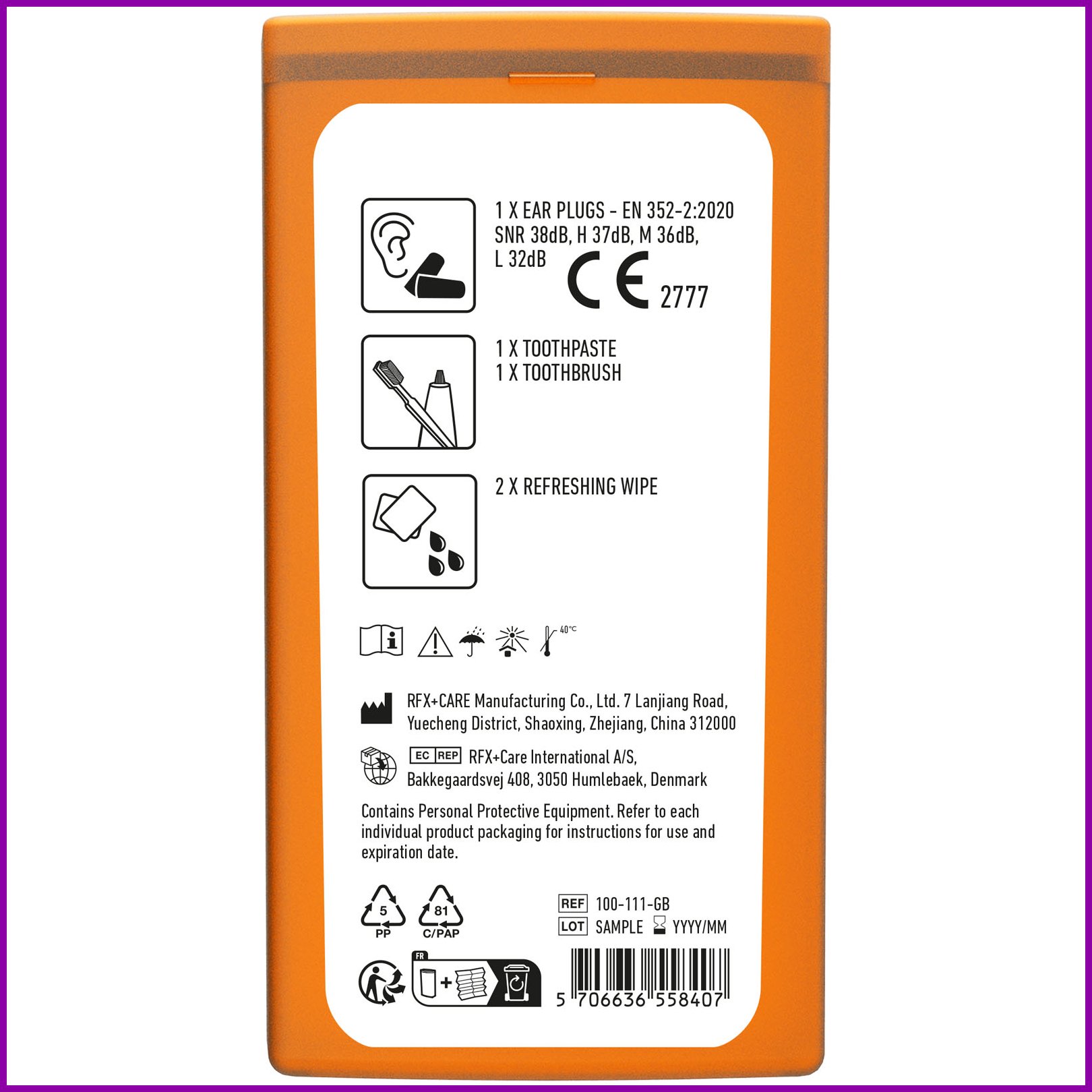 Ihanteellinen matkasarja jokaiselle matkalle. Tämän paketin avulla voit saapua määränpäähäsi rentoutuneena ja raikkaana. Pieni pakkaus on helppo säilyttää laukussa tai taskussa. Sisältö: 1 hammasharja, 1 hammastahna, 1 korvatulpat ja 2 kosteuspyyhettä. Kaikki pakkauksen sisältämät ensiapu- ja hoitotuotteet täyttävät kaikki soveltuvat EU:n säännökset. Hinta sisältää täysväritulosteen.