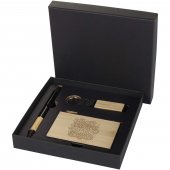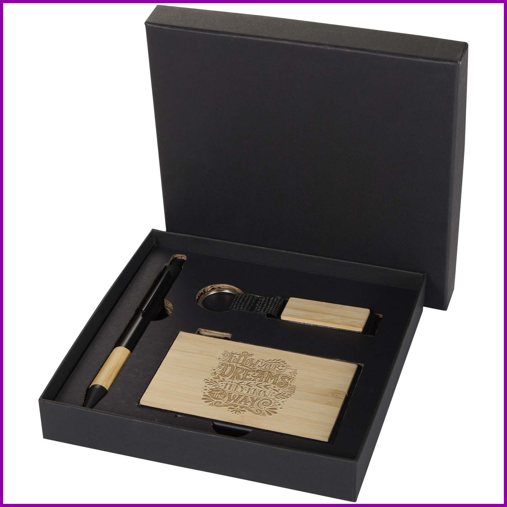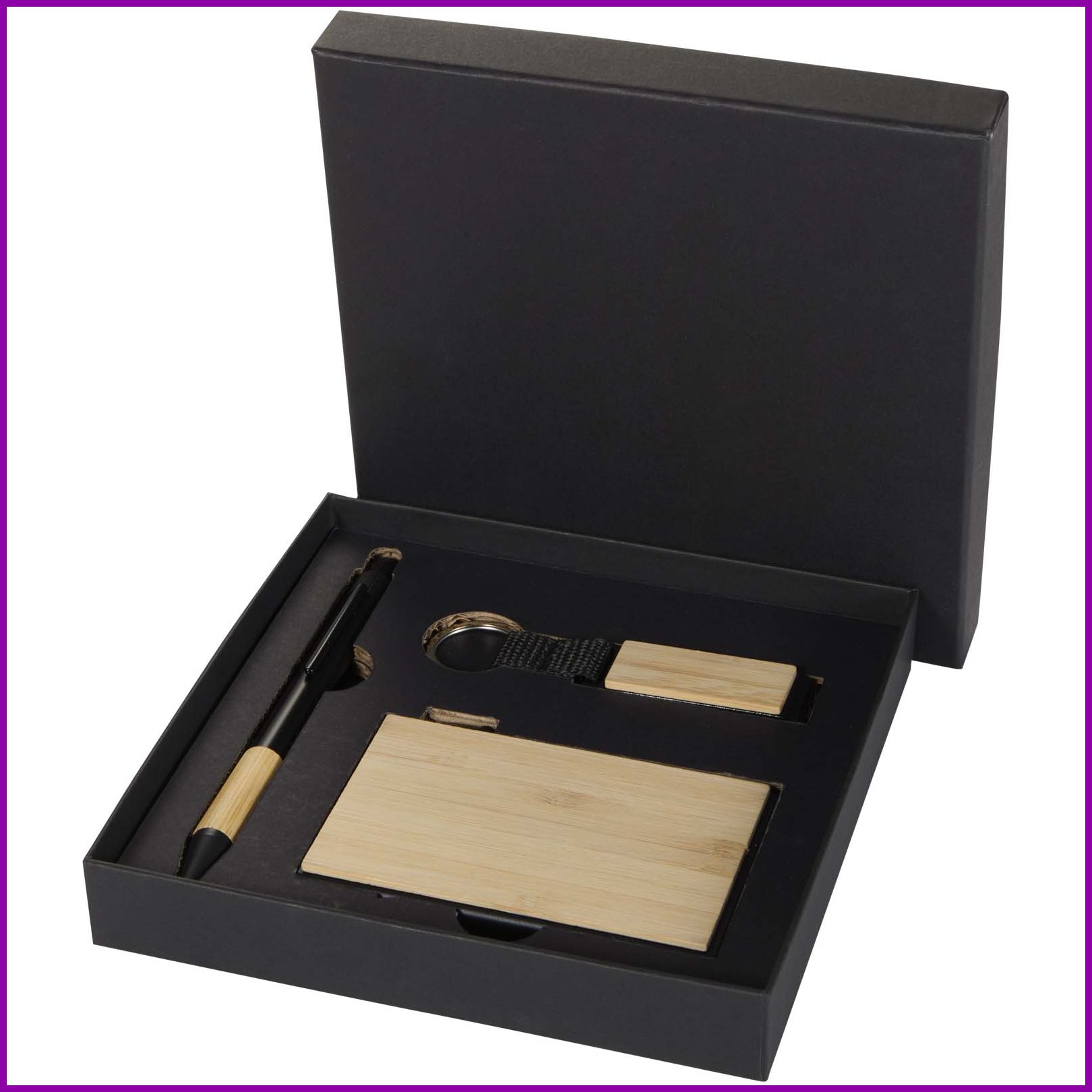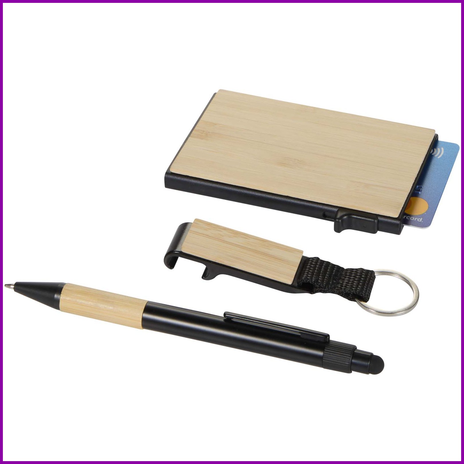 Minka-lahjasetti sisältää RCS-sertifioidusta kierrätetystä alumiinista valmistetun kuulakärkikynän, jossa on tyylikäs bambu yksityskohta ja kosketusnäyttökärki, alumiinisen avaimenperän (5,5 × 1,8 × 1 cm) bambuyksityiskohdilla ja integroidulla puhelinpidikkeellä sekä RFID-korttikotelon (9,7 × 6,2 × 1 cm), jossa on alumiiniseoksesta valmistettu runko ja bambuyksityiskohtia. Korttikoteloon mahtuu jopa 10 korttia. Kynässä on mustaa mustetta, ja sen kirjoituspituus on 1 000 metriä. Huomaavainen ja käytännöllinen lahja, jossa yhdistyvät käytännöllisyys ja moderni muotoilu. Toimitetaan ensiluokkaisessa mustassa lahjapakkauksessa (16 × 16 × 2,7 cm), jossa on yksivärinen etupuoli, joten se sopii erinomaisesti logon lisäämiseen.