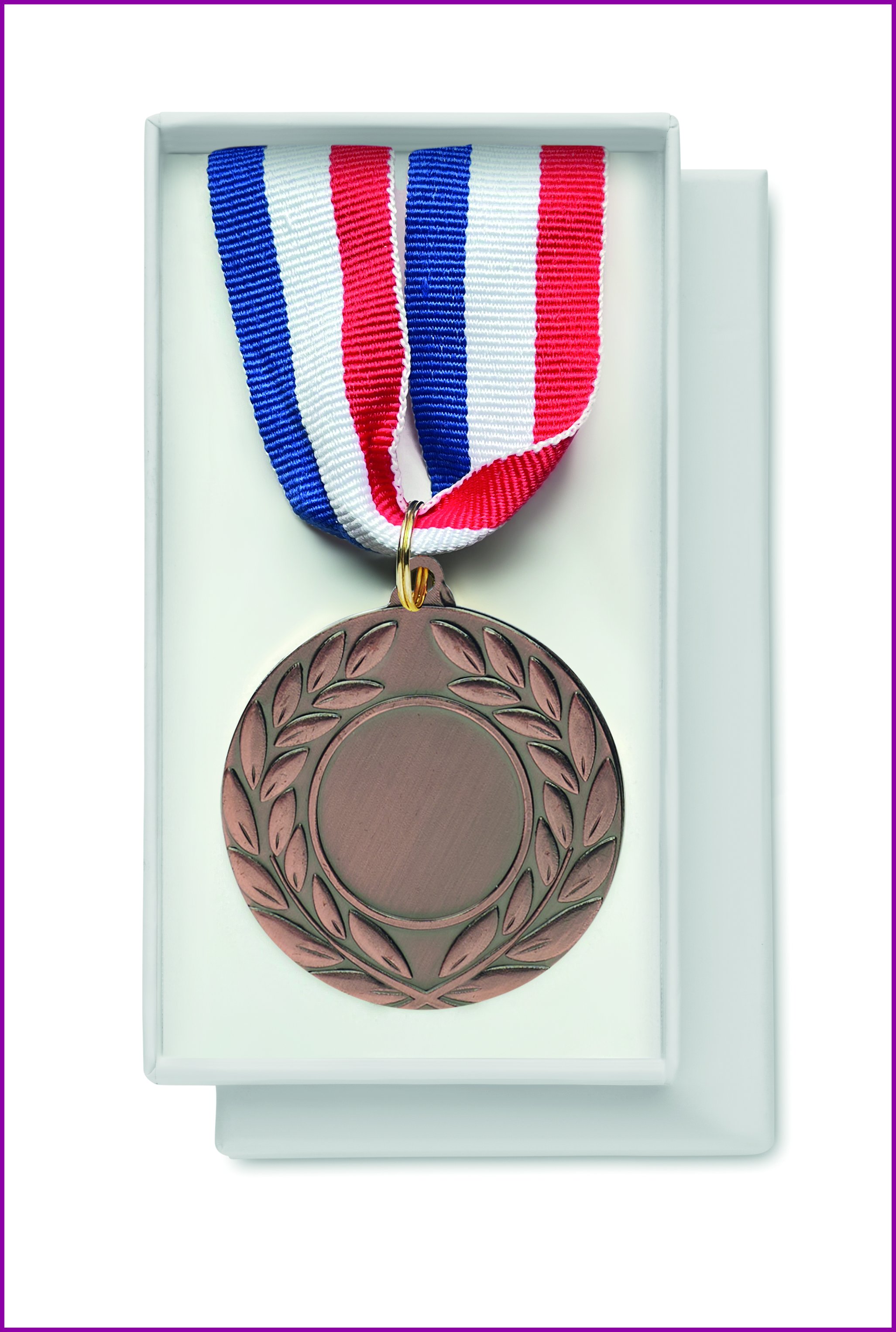 Raudasta valmistettu mitali, jossa on polyesterihihna, värit sininen, valkoinen ja punainen. Halkaisija 5 cm.