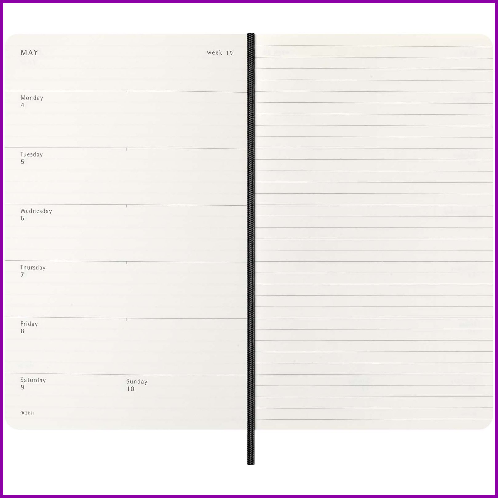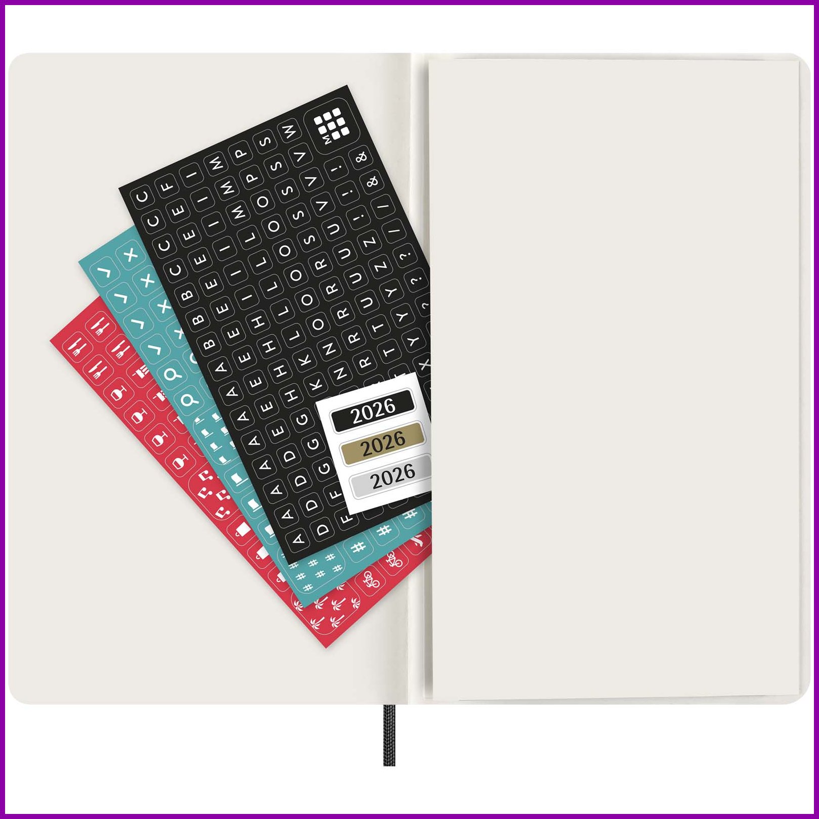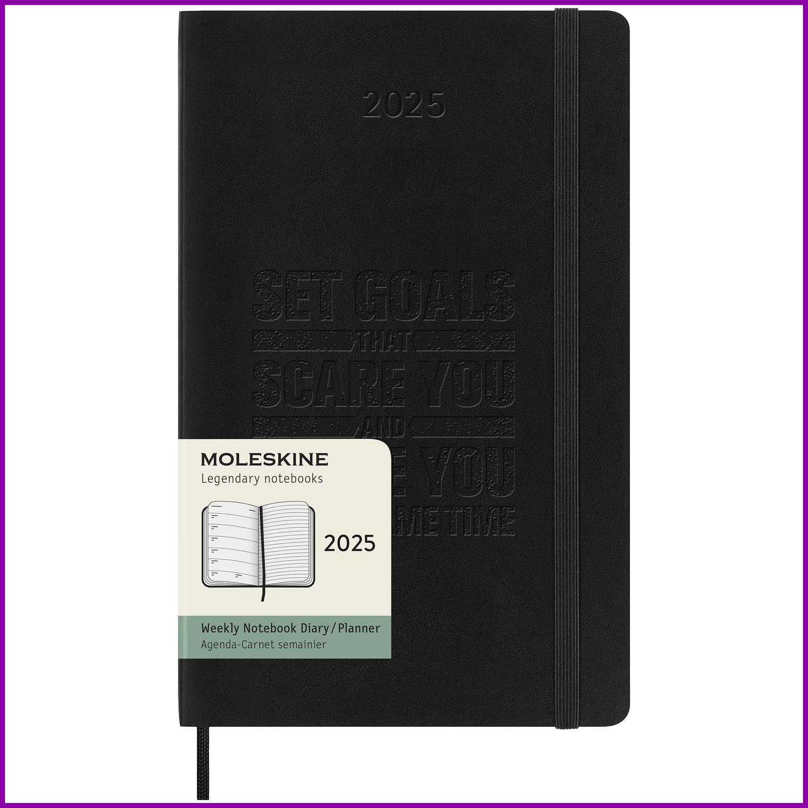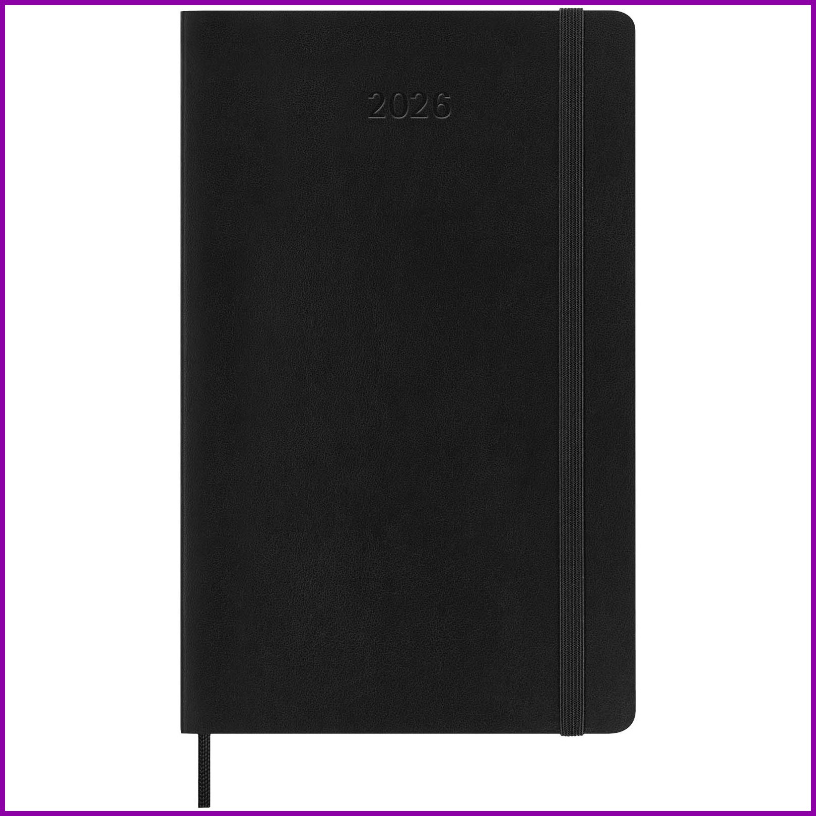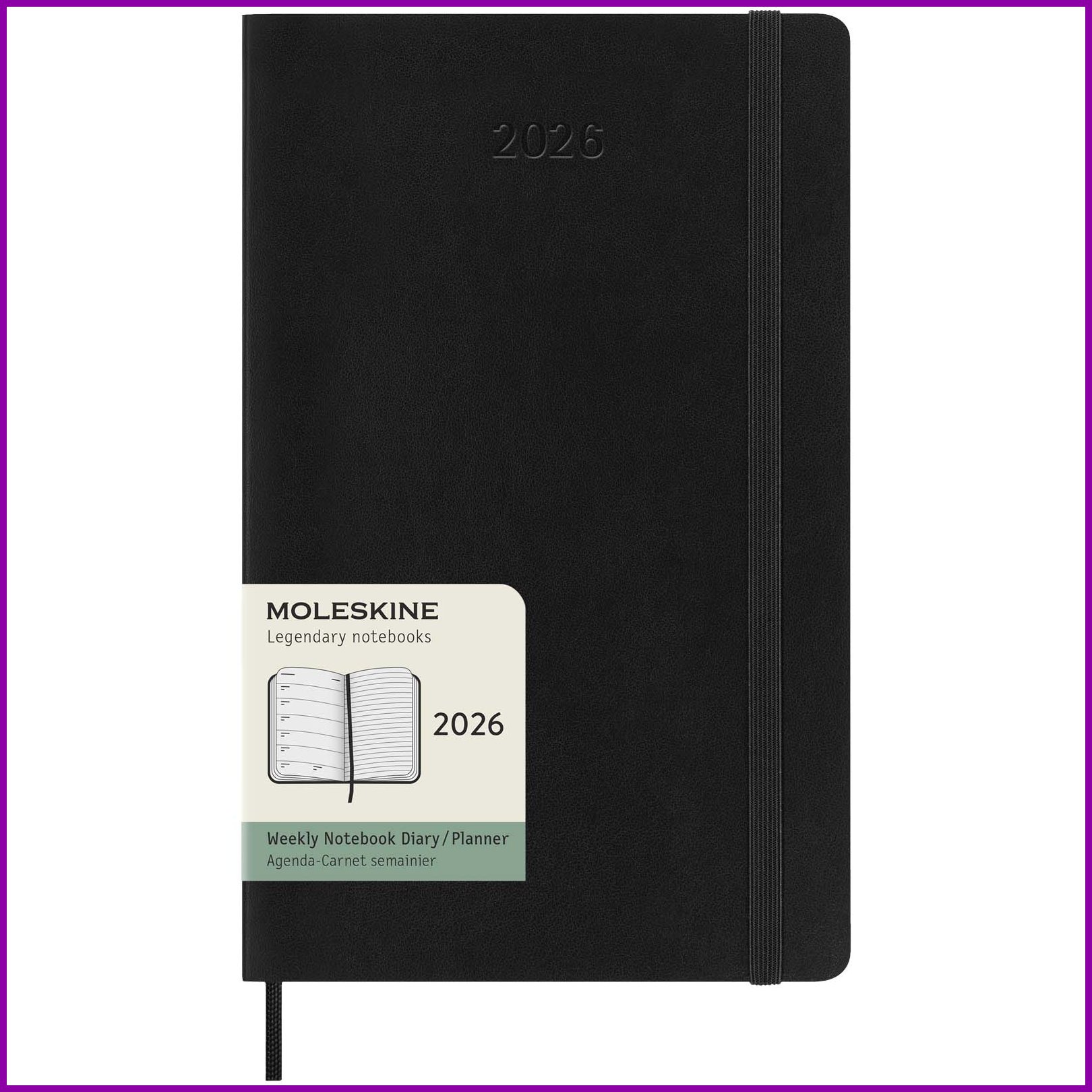 Pehmeäkantisessa Moleskine 12 kuukauden viikkokalenterissa tammikuusta joulukuuhun 2026 näkyy koko viikko yhdellä silmäyksellä. Lisäksi siinä on vuosi- ja kuukausikatsaussivuja laajemman kokonaiskuvan saamiseksi vuodesta sekä sivuja matkasuunnitelmia, ideoita ja tavoitteita varten. Kunkin viikon päivät näkyvät toisella puolella, ja toisella puolella on viivallinen sivu tehtäviä ja muistiinpanoja varten. Päivyrissä on norsunluun väristä hapotonta paperia, musta kuminauhasuljin, sivunauhamerkki, väriltään yhtenevä laajennettava sisätasku, tarroja henkilökohtaiseen räätälöintiin sekä vuositarrat selkäosaan.Värit ja Koot