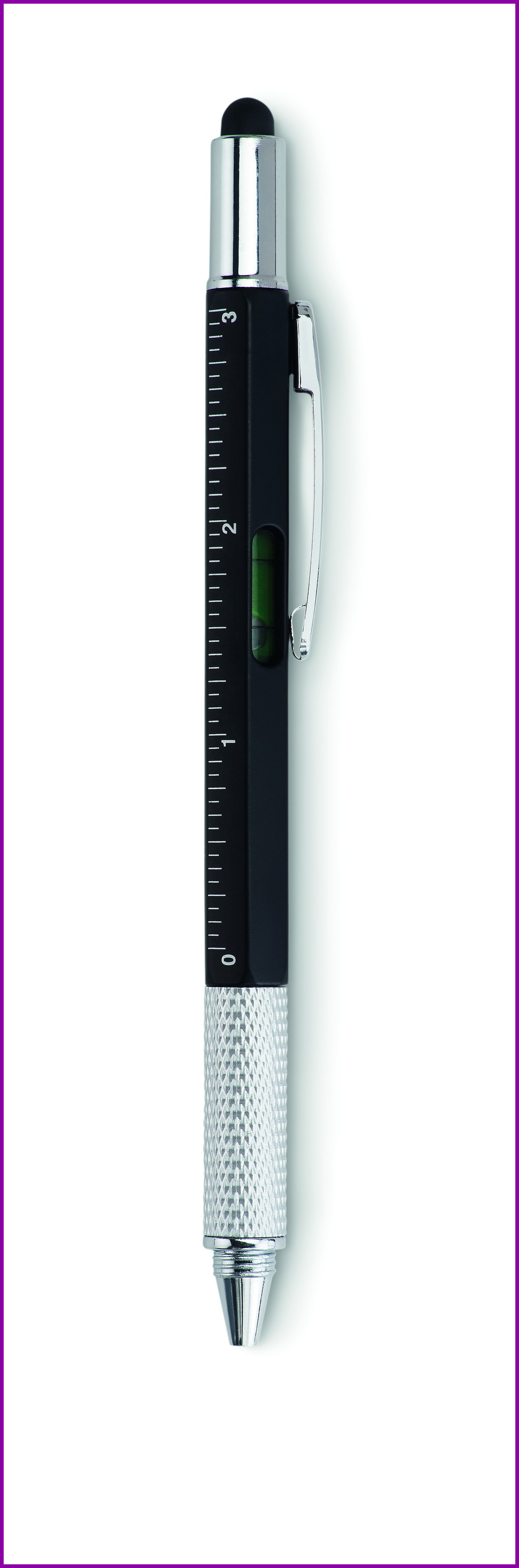 ABS-monitoimikynä mustalla musteella, kiertomekanismilla, viivoittimella ja kosketusnäyttöpäällä. Ristipää ja talttaruuvimeisseli.