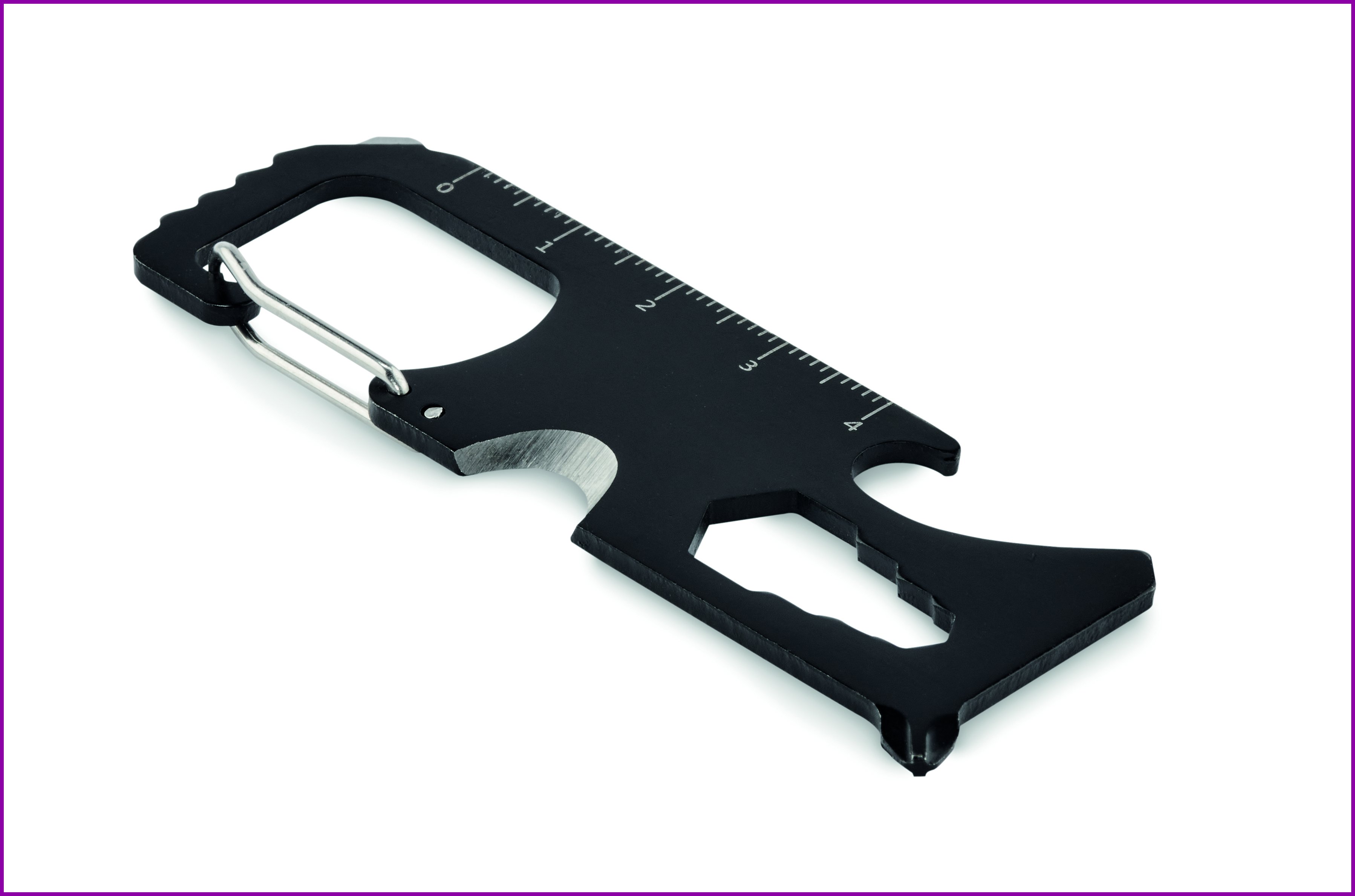 Ruostumattomasta teräksestä valmistettu monitoimityökalu taskukokoisena. 8 toimintoa. Sisältää: hammassaha, lankaleikkuri, jakoavain, Phillips-ruuvimeisseli, urainen ruuvimeisseli, mitta-asteikko, pullonavaaja ja avaimenperä.