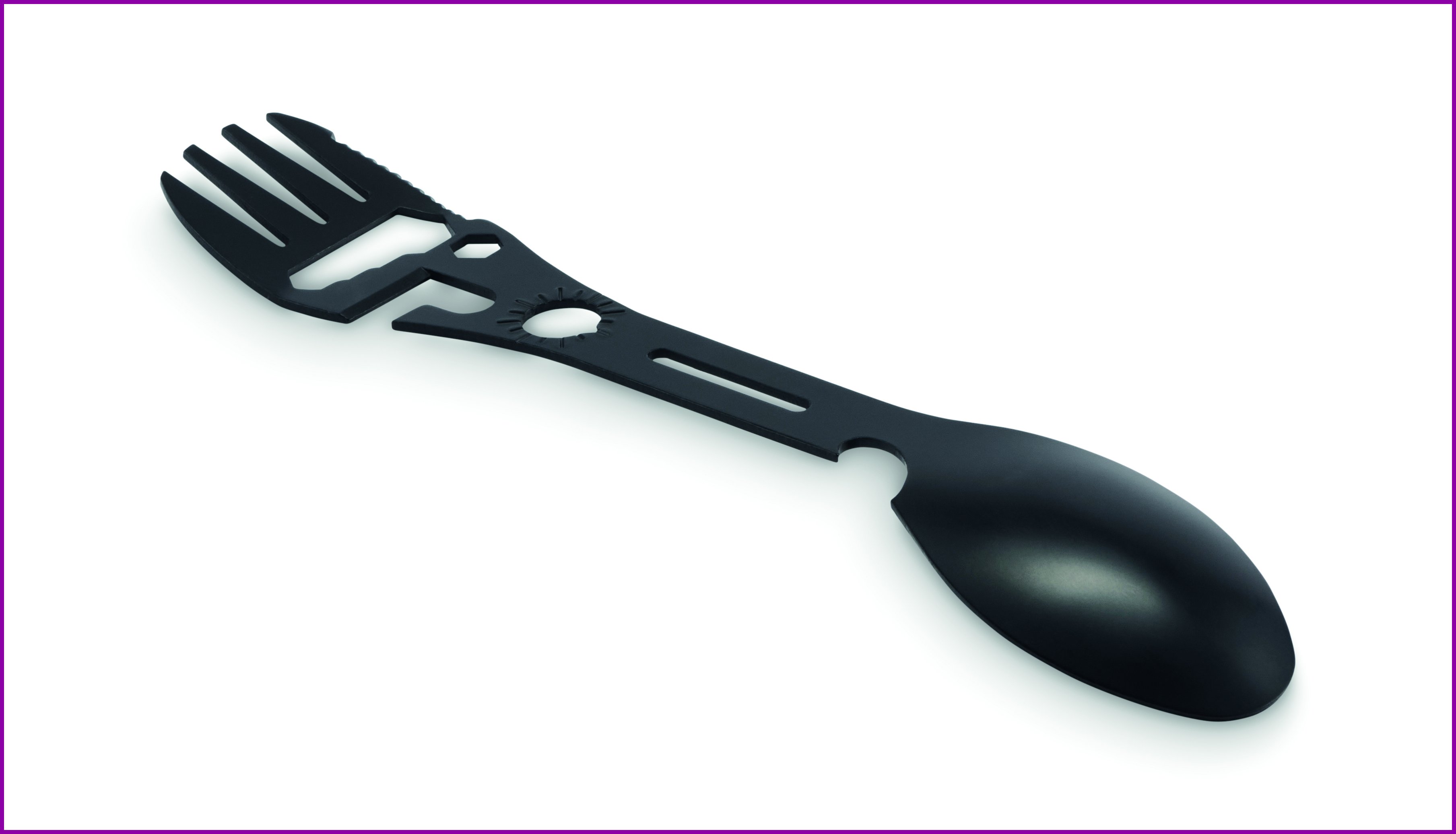 Ruostumattomasta teräksestä valmistetut monitoimiaterimet. Sisältää lusikan, haarukan, säädettävän jakoavaimen, pullonavaajan, kuusiokoloavaimen, sahalaitaisen veitsen, avaimen ja paikoitusavaimen.