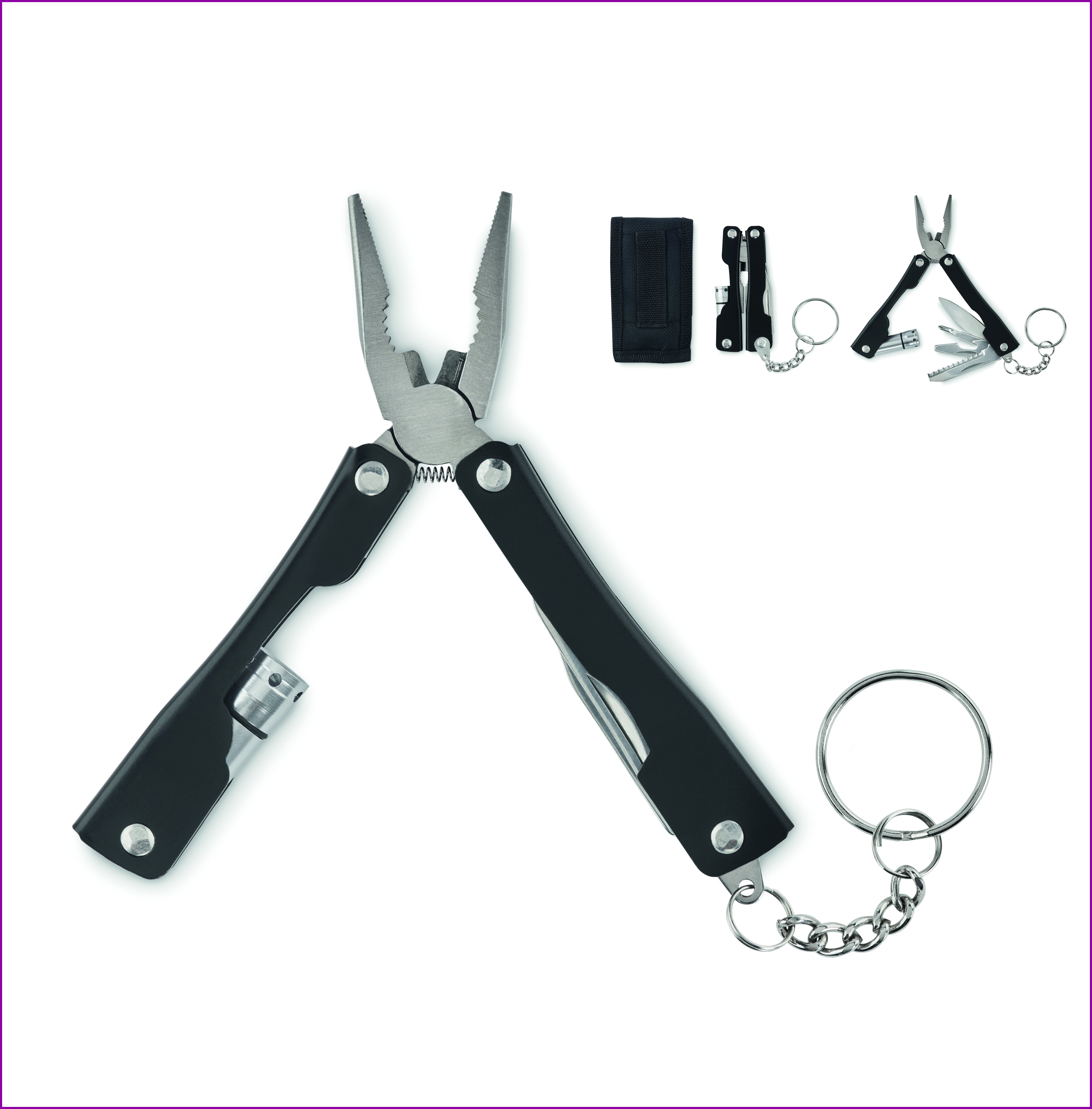 Kokoontaitettava monitoimiveitsi ruostumatonta terästä. Sisältää taskulampun ja 10 työkalutoimintoa sekä 600D-polyesteripussin. Sisältää 3 x AG3-nappiparistoa.